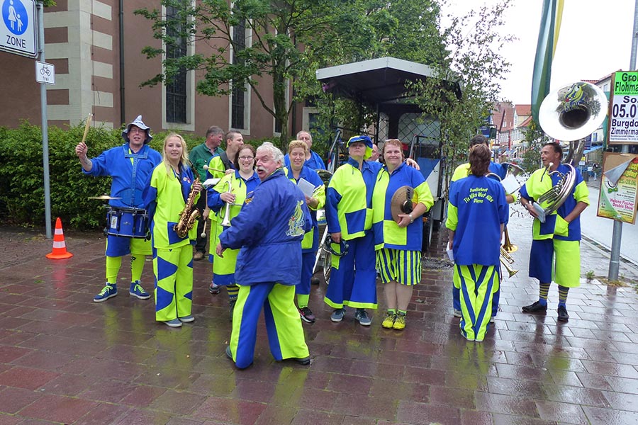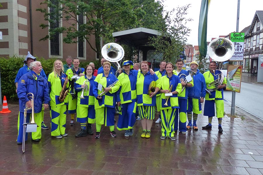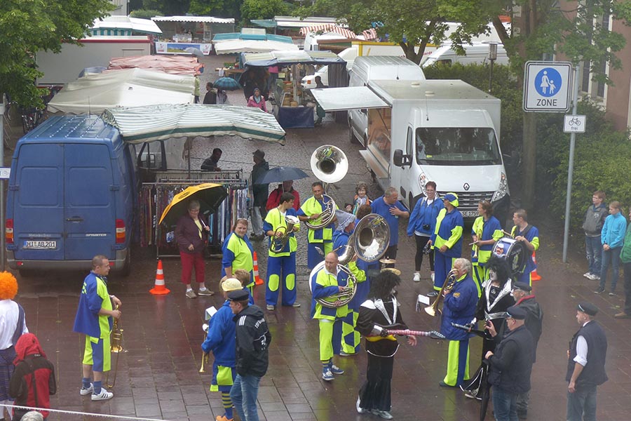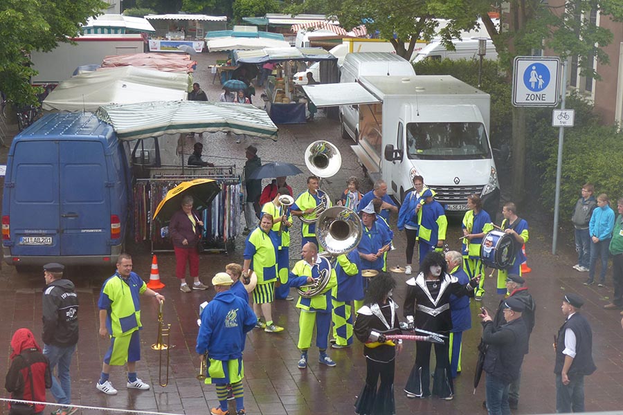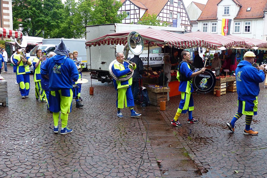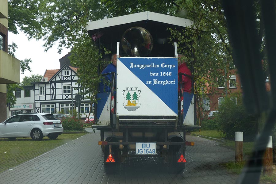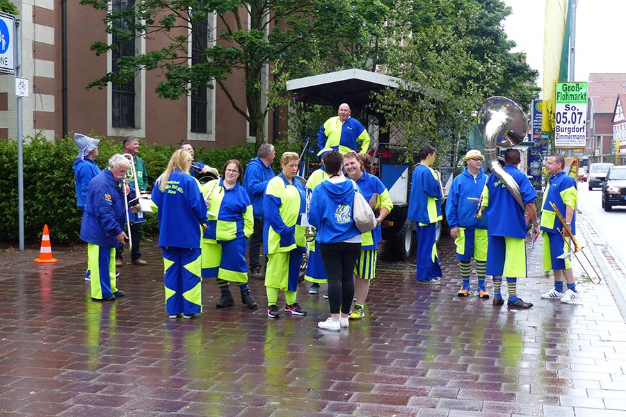 Zwischenzeitlich waren die SpaßmusikerInnen der holländischen Truppe "Tis nix wut nix" in Burgdorf eingetroffen und zu dem fröhlichen Trupp der ‚Junggesellen auf den Wagen gestiegen. Die folgende Sammeltour führte dann musikalisch immer wieder angekündigt und begleitet über verschiedene Stationen im Stadtgebiet mit dem Ziel Spittaplatz und Wochenmarkt um etwa 9:30 Uhr.