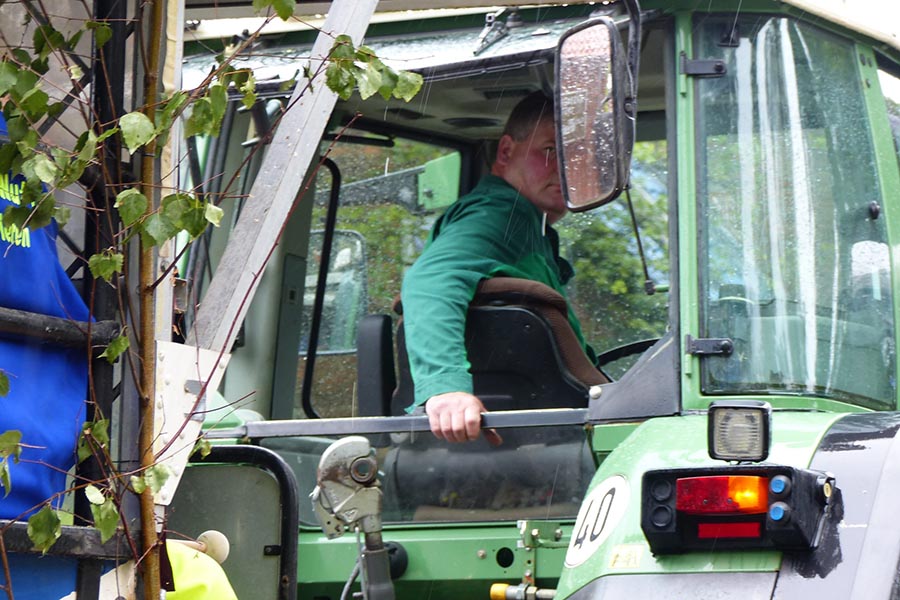 Das Ergebnis sollte dann in einer ersten sinnvollen Nutzung der "berüchtigten" Aue-Sitztreppe mit einem Gruppenfoto dokumentiert werden, die Witterung ließ aber nur zu, schnellstmöglich den geschmückten überdachten und mit geeigneten Durstlöschern ausgestatteten und von einem mächtigen Traktor gezogenen Pferdewagen der "Junggesellen" zu besteigen.