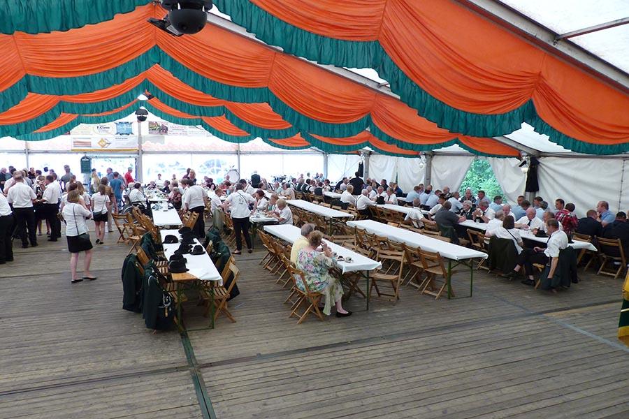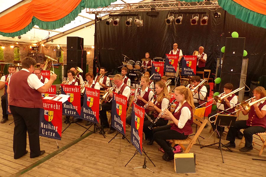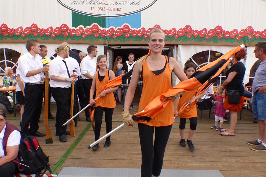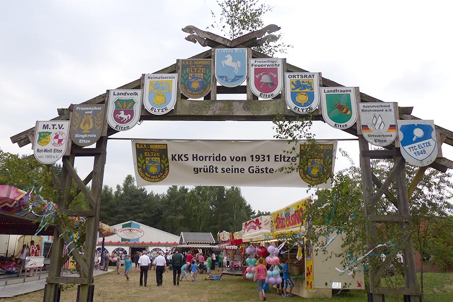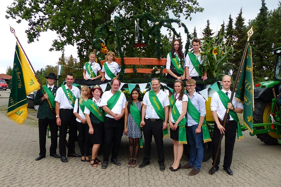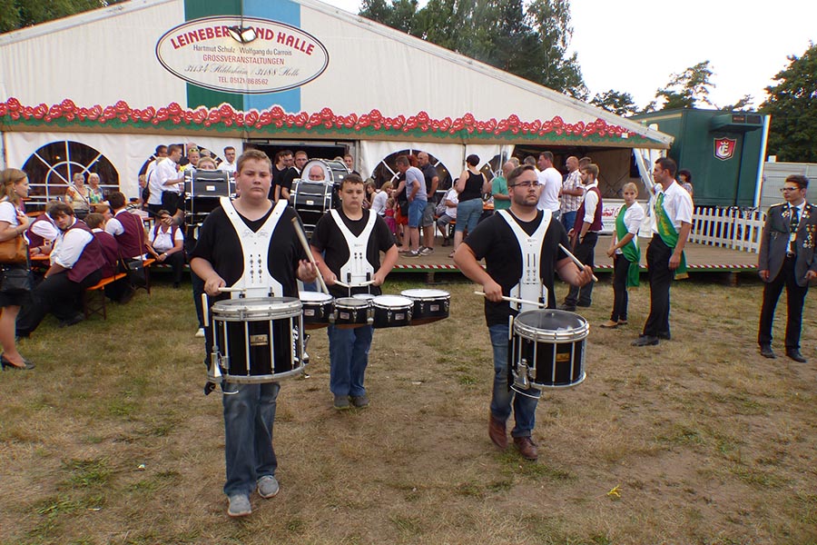 Nachdem der Schützenumzug mit seinen Gastvereinen aus Uetze, die ihren Musikzug der freiwilligen Feuerwehr mitgebracht hatten, aus Schwüblingsen, Altmerdingsen und Plockhorst, sowie dem Drum Corps Blue Eagles aus Mehrum durch das prächtig mit den Insignien der örtlichen Vereine geschmückten Tor den Festplatz erreicht hatten, bedurfte es ob der mittlerweile erreichten Tagestemperatur erstmal eine verdiente Pause zum „Getränke fassen“, bevor sich die diesjährigen Könige und Königinnen mit ihren jeweiligen Begleitern zum traditionellen Gruppenfoto aufstellten: Kinderkönigin Alina Herzog, Jugendkönigin Luisa Melzer, König der Junggesellen Benjamin Schmidt, die Damenkönigin Elke Bahrlau, sowie Bürgerkönig Martin Evers und natürlich die erste Löwenkönigin Marie Kristin Melzer.