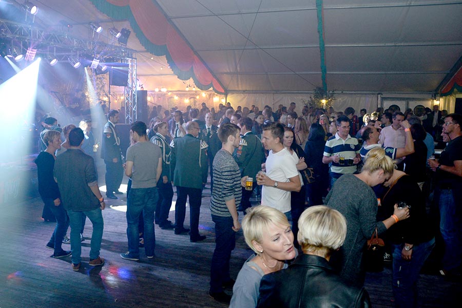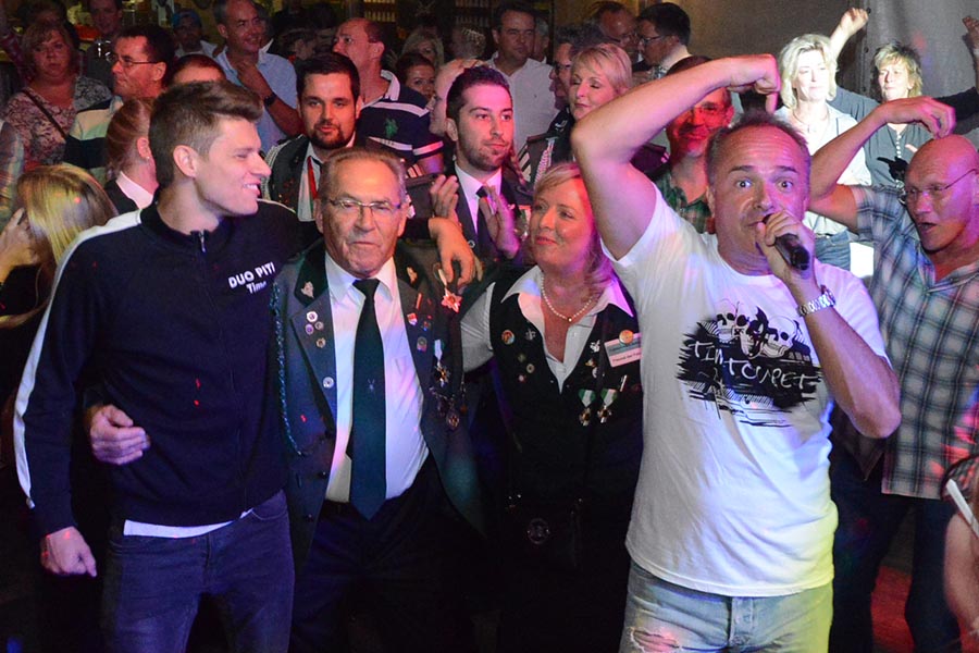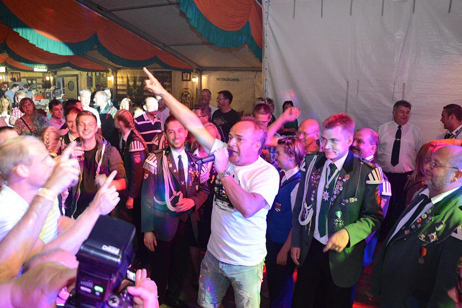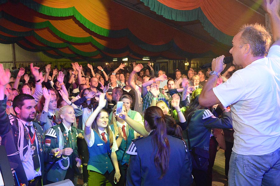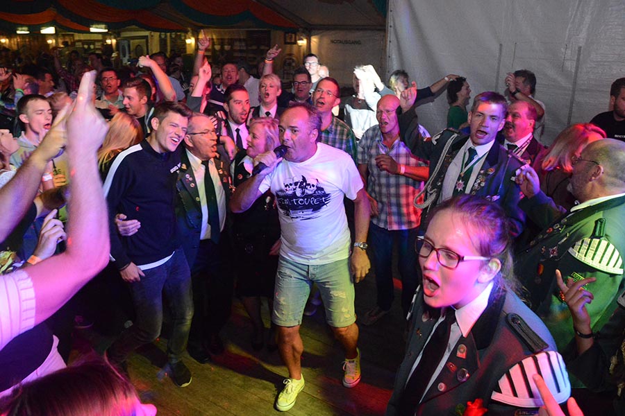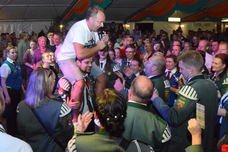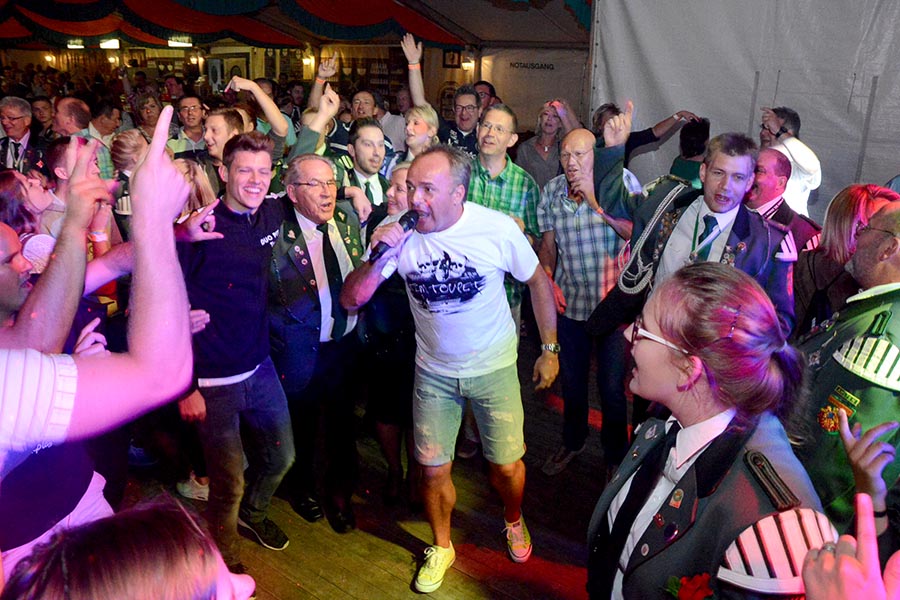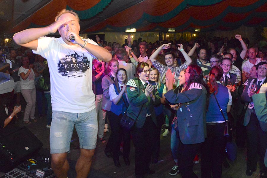 Mit dem "Fliegerlied" brachte er die Zuschauer sofort auf Betriebstemperatur. Gefolgt von "Ich bin ein Döner" und "Allee Allee (eine Straße, viele Bäume)". Da wähnte sich so mancher direkt im Bierkönig in der Schinkenstrasse. Mit seiner einnehmend kölschen Art hätte er alleine schon mit seinen Liedern die Menge begeistern können, doch Tim Toupet ist Ballermann-erfahren und so suchte er nach wenigen Minuten das erste Mal die Tanzfläche auf. Gefolgt von seinen Fans, die immer auf der Suche nach dem passenden Selfie waren. Er tanzte ausgiebig mit Schützen und Gästen. Als er dann auch noch auf die Schultern eines Schützen stieg, meinte man fast, er sei der nette Kerl von nebenan, der einfach nur gute Stimmungsmusik macht. Von Starallüren oder Berührungsängsten war nichts zu sehen. Und die Ahltener machten ausgelassen mit.