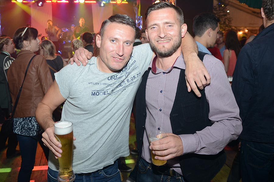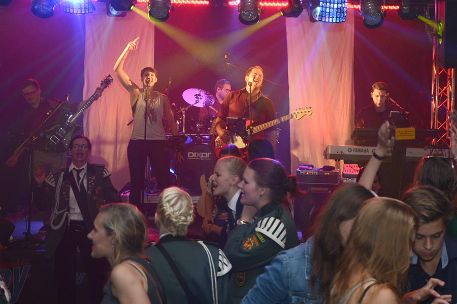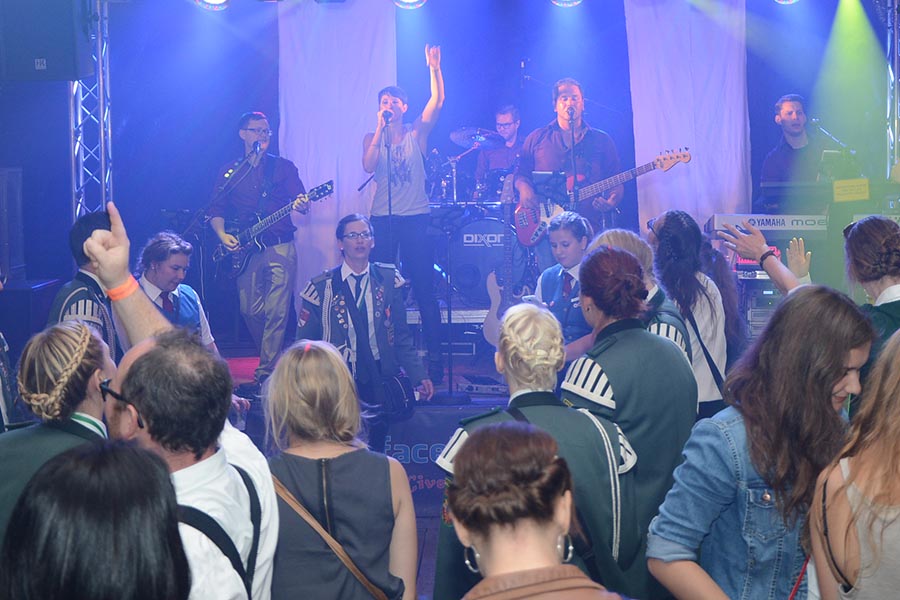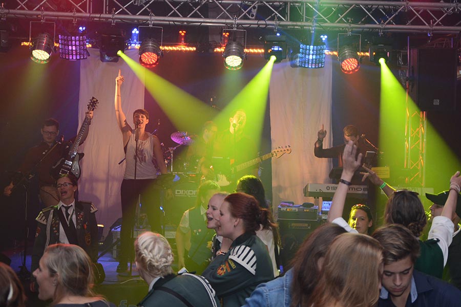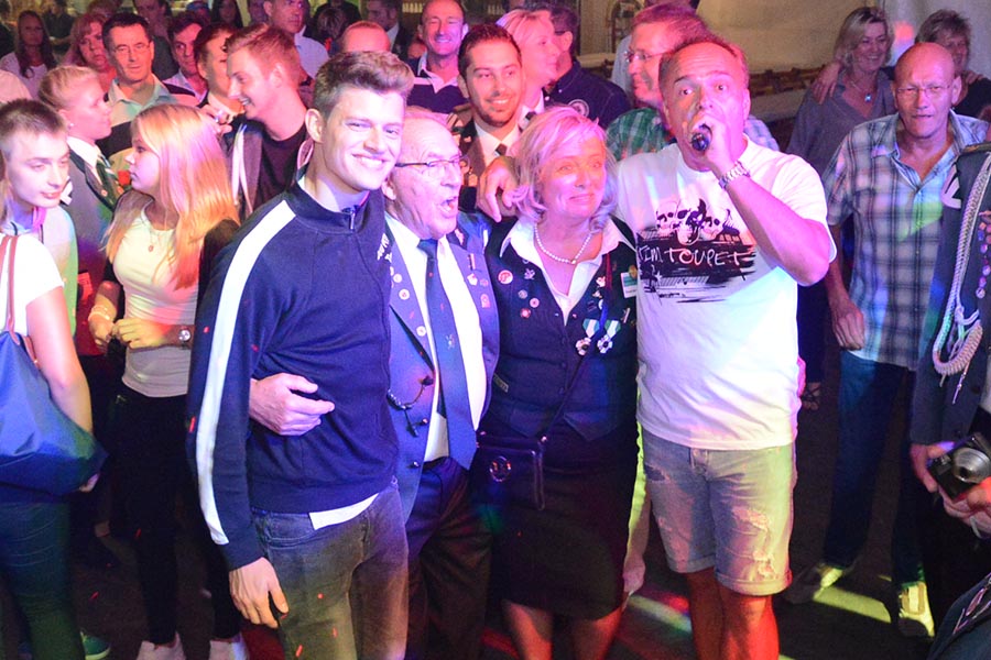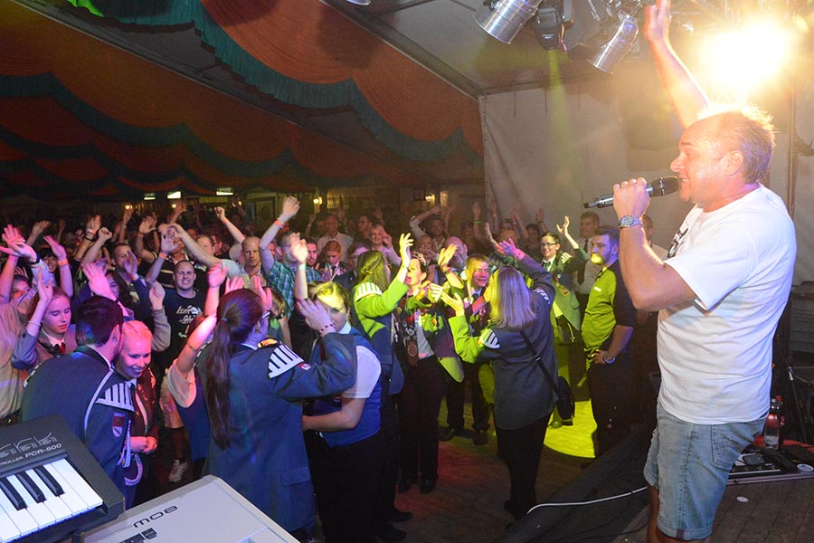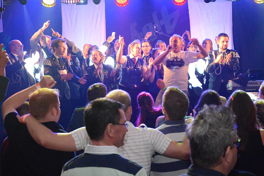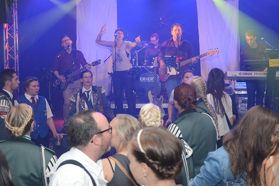 Mit dem "Fliegerlied" brachte er die Zuschauer sofort auf Betriebstemperatur. Gefolgt von "Ich bin ein Döner" und "Allee Allee (eine Straße, viele Bäume)". Da wähnte sich so mancher direkt im Bierkönig in der Schinkenstrasse. Mit seiner einnehmend kölschen Art hätte er alleine schon mit seinen Liedern die Menge begeistern können, doch Tim Toupet ist Ballermann-erfahren und so suchte er nach wenigen Minuten das erste Mal die Tanzfläche auf. Gefolgt von seinen Fans, die immer auf der Suche nach dem passenden Selfie waren. Er tanzte ausgiebig mit Schützen und Gästen. Als er dann auch noch auf die Schultern eines Schützen stieg, meinte man fast, er sei der nette Kerl von nebenan, der einfach nur gute Stimmungsmusik macht. Von Starallüren oder Berührungsängsten war nichts zu sehen. Und die Ahltener machten ausgelassen mit.