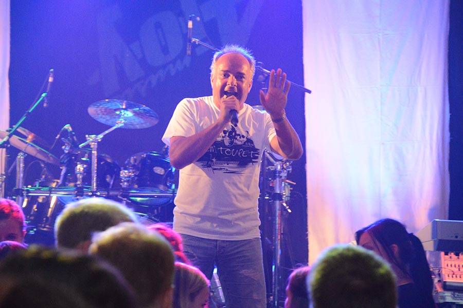 So holte er sich eine Musikerin des Flötenorchesters auf die Bühne, mit der Bitte, doch alle Musiker heraufzuholen. Und so tummelten sich umgehend rund 20 Musiker von Flötenorchester und Ahltener Musikanten auf der Bühne, was längst nicht alle Mitglieder der beiden Musikgruppen waren, doch damit hatte selbst Tim Toupet nicht gerechnet. Es folgte eine ausgelassene Feier auf und vor der Bühne – und der singende Friseur, wie er sich selbst nennt, mal hier und mal da. So war es für alle ein Muss, dass nach 30 Minuten noch eine Zugabe gegeben werden musste, ehe der Star gehen durfte.