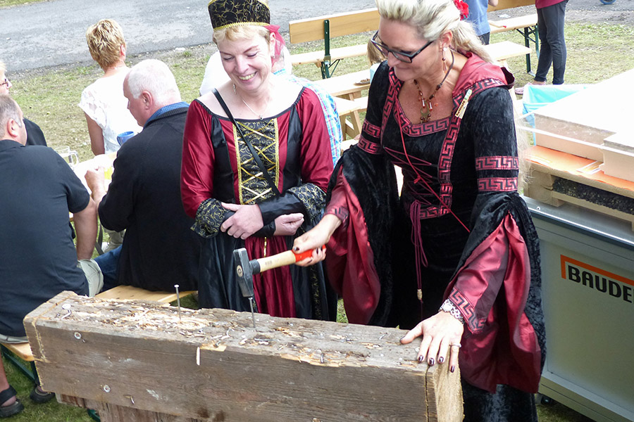 Leider endete zwischenzeitlich eine "Auseinandersetzung" der Jungritter Theo und Bennet vor der Bühne mit einem Ergebnis, bei dem Jungritter Bennet l einen oralen, aber scheinbar hilfreichen Trost benötigte, während die "Nagelprobe" der Damen Martina (Frickman) und Inga (Hoffmann) von und zu Katensen ohne erkennbare Verletzungen, aber mit viel Spaß unterschiedliche Erfolge zeigte.