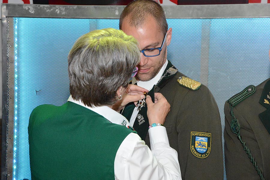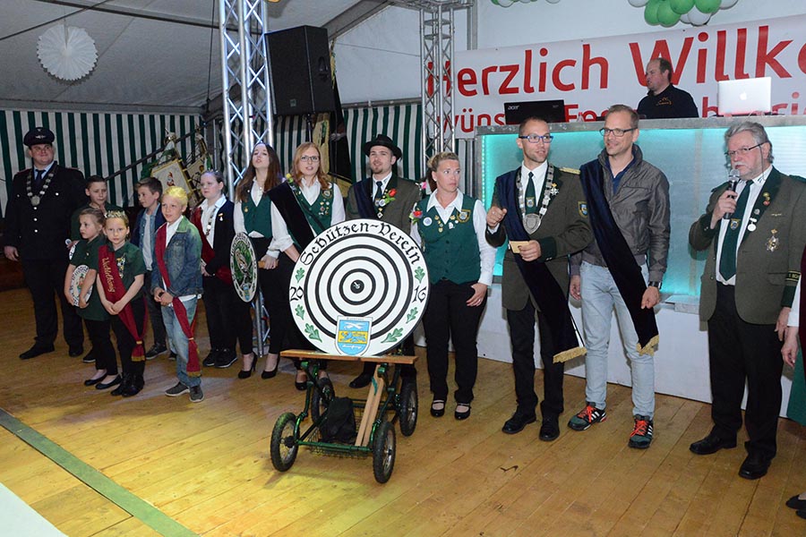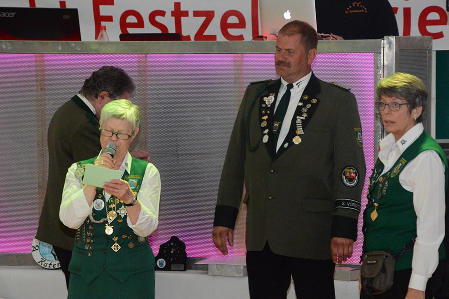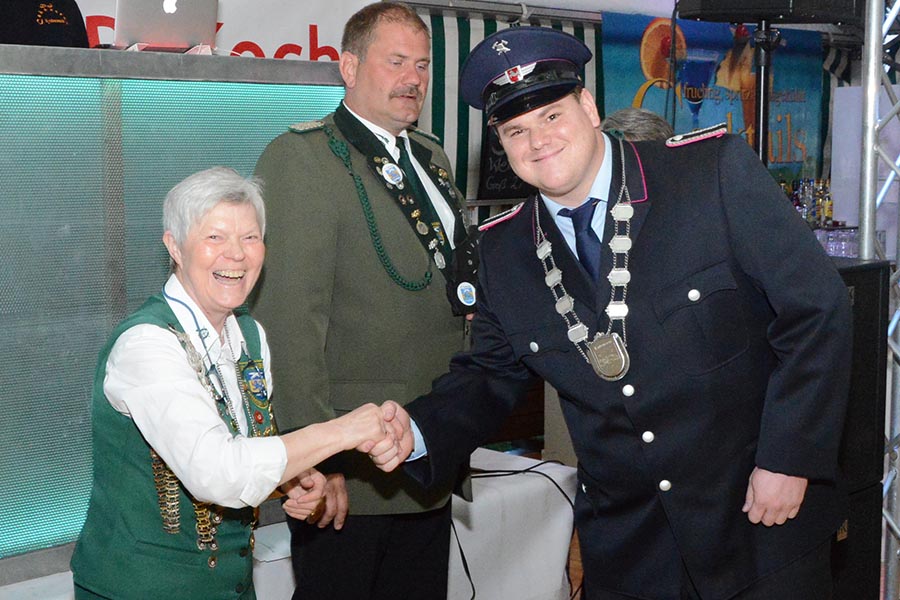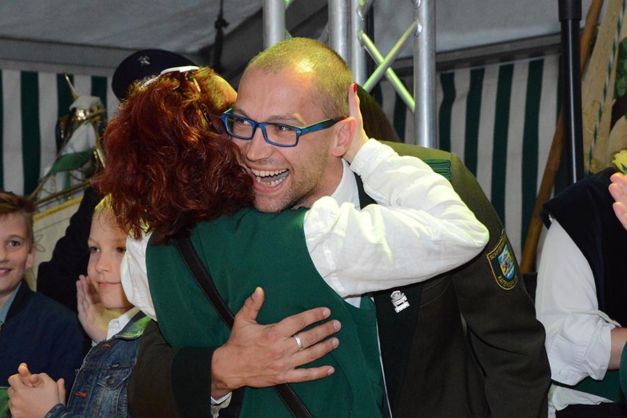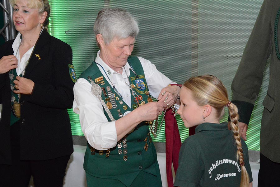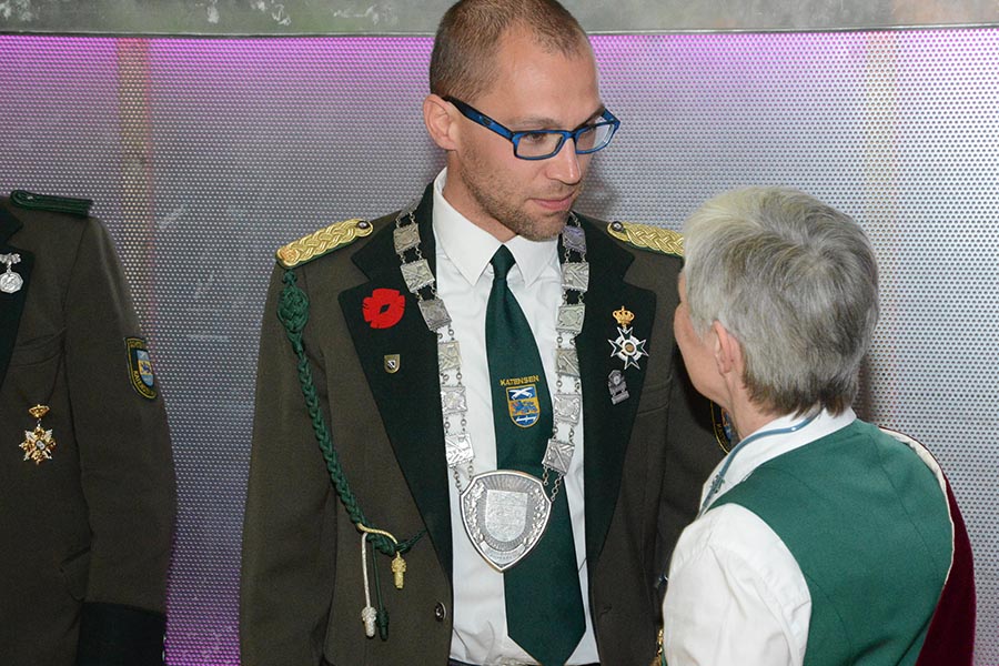 Am heutigen Freitagabend feierte er mit seinem Team Premiere an der Katenser Hauptstraße bei der Eröffnung des Schützenfestes und der Bekanntgabe der neuen Majestäten. Rund 150 Besucher fanden sich bei der Proklamation ein, bei der es ebenfalls eine Änderung zu den Vorjahren gab: Erstmals schossen Schützendamen und -herren auf eine gemeinsame Scheibe und nicht mehr auf zwei getrennte. Die Ursache rührte daher, dass bei den Herren die Beteiligung am Königsschießen nachließ. Zum Stechen im Schützenhaus kurz vor der Eröffnung des Schützenfestes qualifizierten sich so nur zwei Schützen für die Endrunde, hätten sie doch eigentlich 4 Schützen stellen können. So gewann Sven Peterhänsel in diesem Jahr die Schützenwürde, Zweitplatzierte und somit Damenbeste wurde die 1. Vorsitzende, Ute Miehe. Zum Jugendkönig wurde Sascha Gräve proklamiert, Kinderkönig ist nun Hermine Heitmüller. Die schmucke Scheibe des Wichtelkönigs, mit einem Wichtel als Motiv, holte sich Nele Judel, Tochter von Ortsbrandmeister Andre Judel. Und die Feuerwehr hatte noch eine zweite "Vertretung" unter die Schützen gemischt: Stefan Möbius von der Freiwilligen Feuerwehr wurde Bürgerkönig.