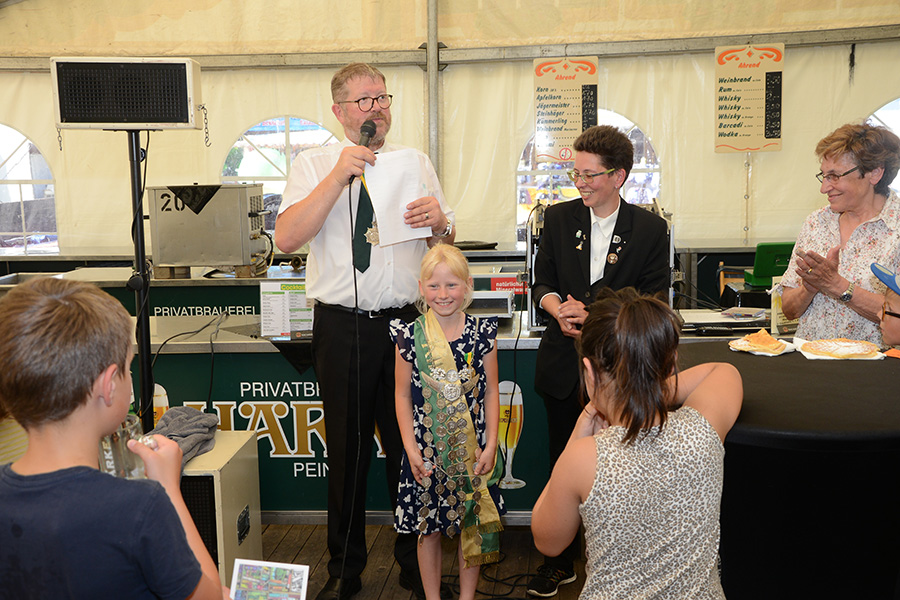 Mit strahlenden Augen nahm die 7-jährige Leah-Sophie Bähre den Preis als Kinderkönigin des Burgdorfer Schützenfestes entgegen. Mit 40,4 Ring gewann sie unter den 30 teilnehmenden Kindern im Alter von 6 bis 12 Jahren die Konigswürde und somit die erste Würde, die an diesem Schützenfestwochenende zu vergeben war. Sie bekam das nicht nur die Königskette überreicht, sondern Rolf Hoppe, Kommandeur der Burgdorfer Schützengesellschaft von 1593 e.V., überreichte ihr im Schützenzelt am heutigen Donnerstag, 23. Juni 2016, einen Gutschein für ein Fahrrad. Aber auch andere junge Schützen, die laut Ausschreibung nicht Mitglied in der Schützengesellschaft sein dürfen, gewannen tolle Preise wie ein Longboart, ein Smartphone oder ein Tablett, unterstützt durch Geld- und Sachspenden zahlreicher Burgdorfer Firmen, die im Eingangsbereich des Festzeltes besondere Erwähnung finden. Das Mitmachen beim Kinderkönigsschießen eine Woche vor Beginn des Schützenfestes hat sich also für so manchen jungen Teilnehmer gelohnt.