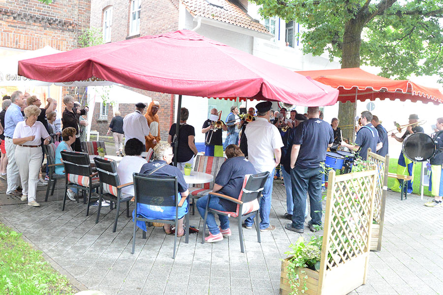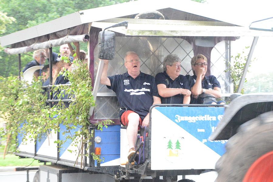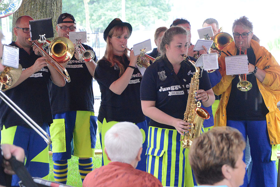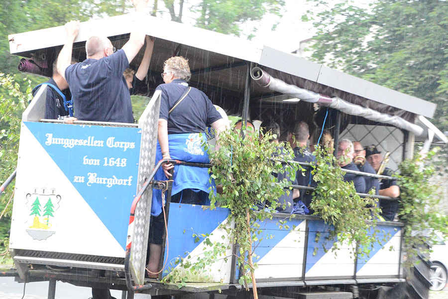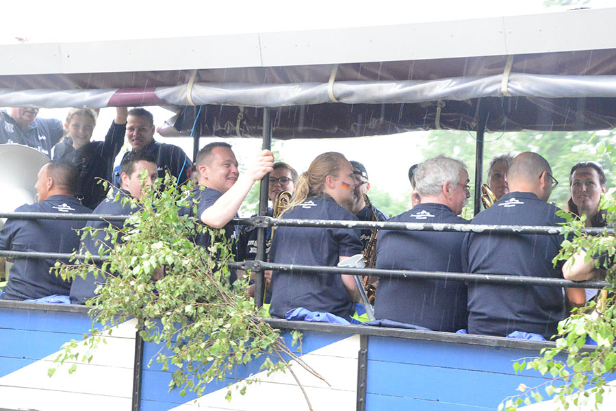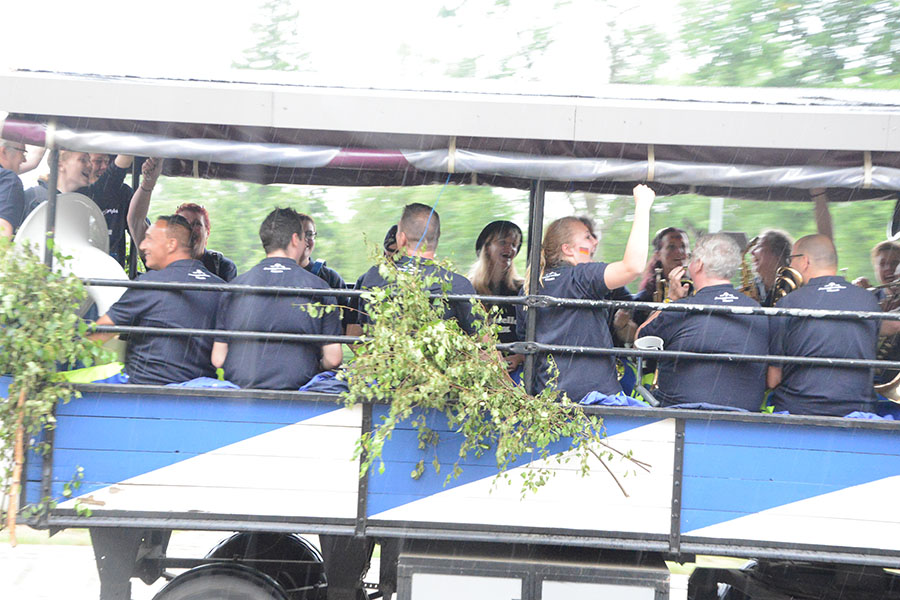 Die Junggesellen wurden hierbei musikalisch unterstützt von ihren holländischen Freunden der Tis Niks Wut Niks, die in diesem Jahr ihr 25-jähriges Bestehen feiern. Das wurde natürlich ausgiebig gefeiert. Mehrere Platzkonzerte in der Innenstadt wurden gegeben, vor dem Modefachgeschäft Petrick Moden sammelten sich gegen Mittag rund 60 Besucher unter drei großen (Sonnen-)Schirmen, um sich vor dem niedergehenden Regen zu schützen. Zum dritten Mal hatte Jörg Petrick die Musiker und Junggesellen vor sein Geschäft eingeladen. Die Tis Niks Wut Niks kamen auf einem Treckergespann angereist, nicht ohne vorher eine dreimalige Runde durch den Kreisel zu machen und sich hierbei ordentlich feiern zu lassen. Danach legten sie gleich mit Guter-Laune Musik ("Take on me" von a-ha) los. Der Regen wurde stärker, die Stimmung dagegen besser: So geht feiern in Burgdorf. Für alle, die es verpasst haben: Die Holländer spielen heute Abend, Sonnabend, 25. Juni 2016, um 22 Uhr im Festzelt noch einmal auf.