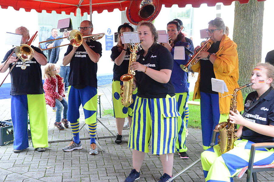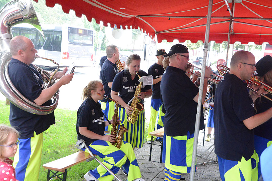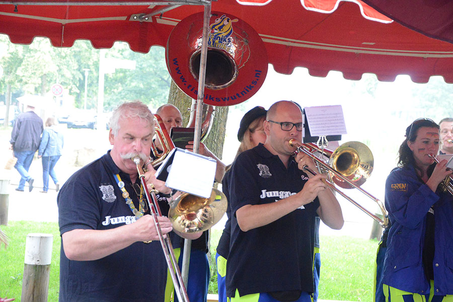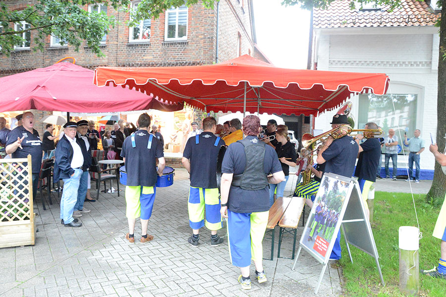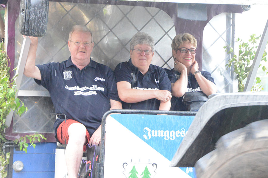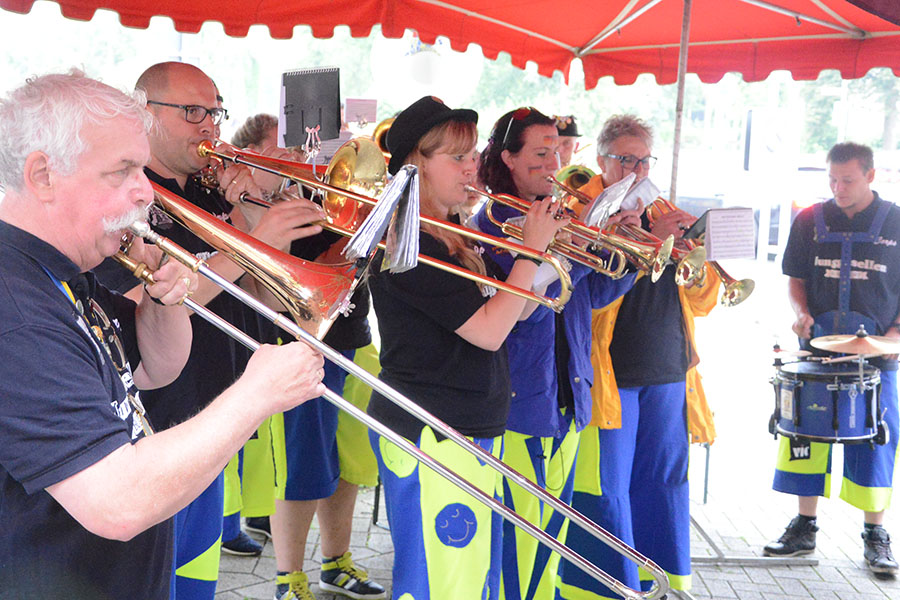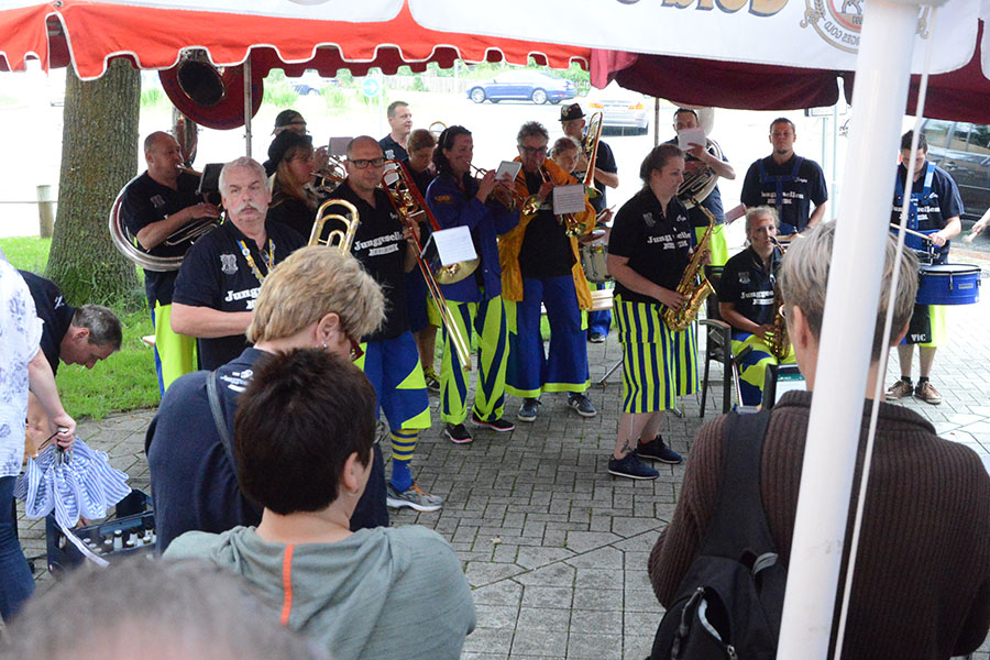 Die Junggesellen wurden hierbei musikalisch unterstützt von ihren holländischen Freunden der Tis Niks Wut Niks, die in diesem Jahr ihr 25-jähriges Bestehen feiern. Das wurde natürlich ausgiebig gefeiert. Mehrere Platzkonzerte in der Innenstadt wurden gegeben, vor dem Modefachgeschäft Petrick Moden sammelten sich gegen Mittag rund 60 Besucher unter drei großen (Sonnen-)Schirmen, um sich vor dem niedergehenden Regen zu schützen. Zum dritten Mal hatte Jörg Petrick die Musiker und Junggesellen vor sein Geschäft eingeladen. Die Tis Niks Wut Niks kamen auf einem Treckergespann angereist, nicht ohne vorher eine dreimalige Runde durch den Kreisel zu machen und sich hierbei ordentlich feiern zu lassen. Danach legten sie gleich mit Guter-Laune Musik ("Take on me" von a-ha) los. Der Regen wurde stärker, die Stimmung dagegen besser: So geht feiern in Burgdorf. Für alle, die es verpasst haben: Die Holländer spielen heute Abend, Sonnabend, 25. Juni 2016, um 22 Uhr im Festzelt noch einmal auf.