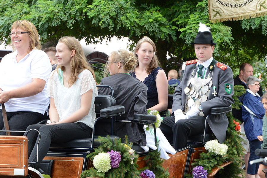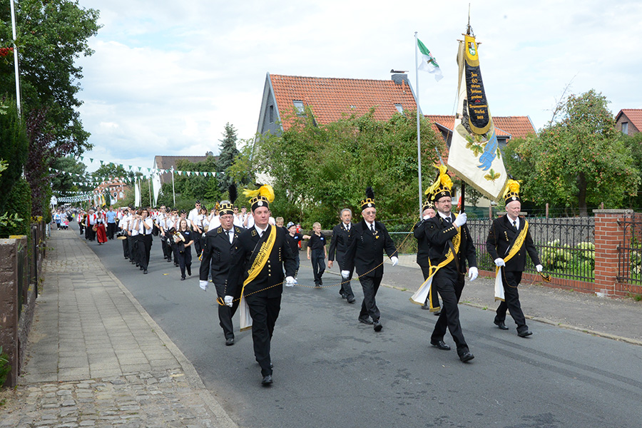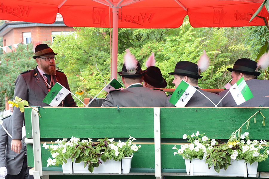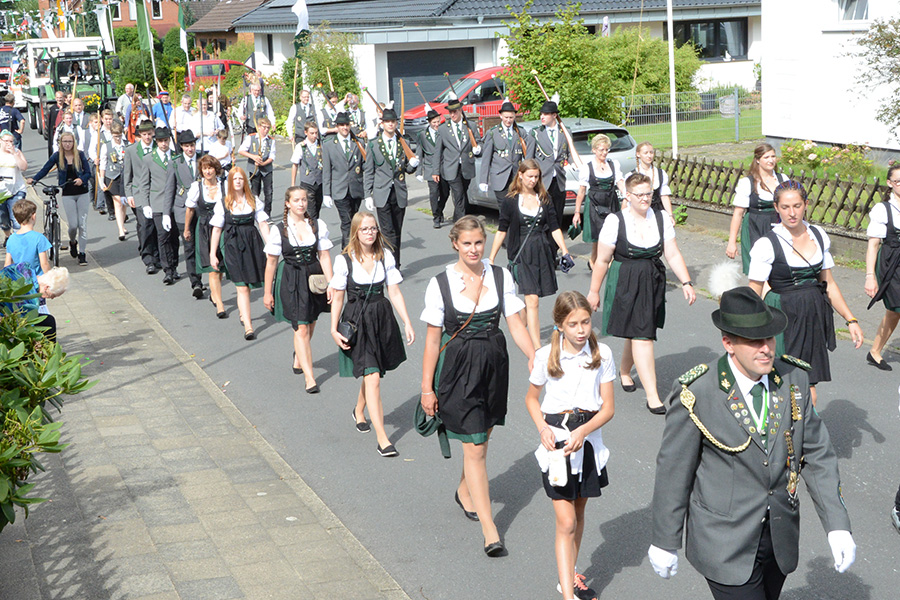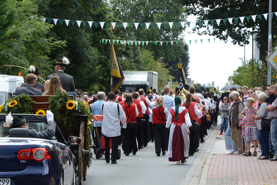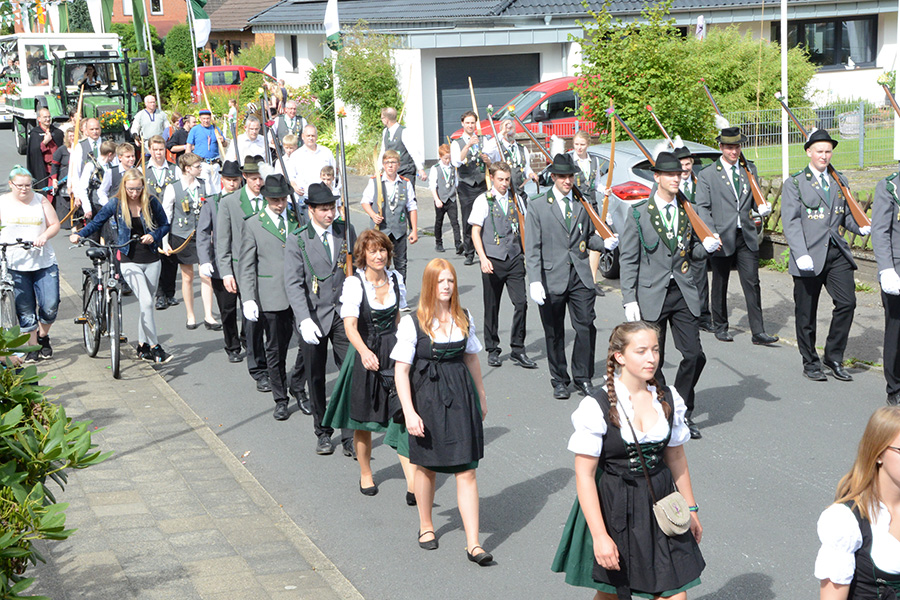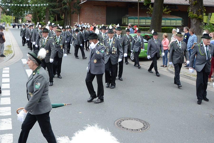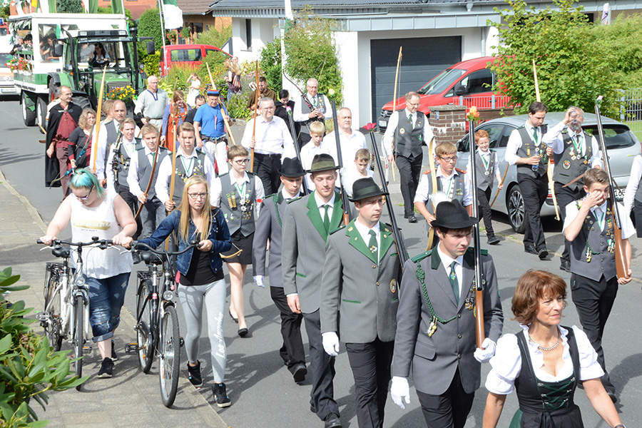 So verfolgten wieder hunderte Besucher den Festumzug und viele nahmen ein paar Meter Fußweg in Kauf, um den Festumzug noch ein weiteres Mal zu sehen, was einer kleinen Völkerwanderung gleich kam. So war die Kreuzung am Pappaul, wie auch die Henighuser Straße zwischen Breitenkampstraße und Windmühlenstraße besonders beliebte "Aussichtspunkte". Letzterer sogar doppelt, denn hier kam der Umzug zwei Mal vorbei. Da taten auch ein paar Tropfen Regen der Stimmung keinen Abbruch. Nach dem kleinen Schauer schaute sogar wieder Sonne durch die Wolken und begleitete schützen und ihre Gäste auf dem Weg zurück zum Festplatz.