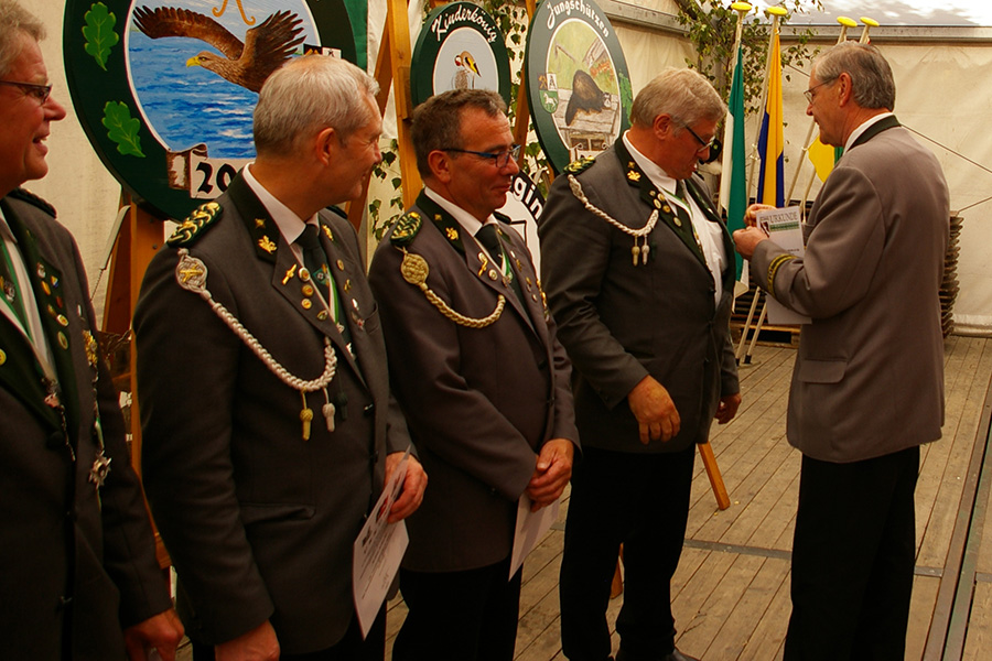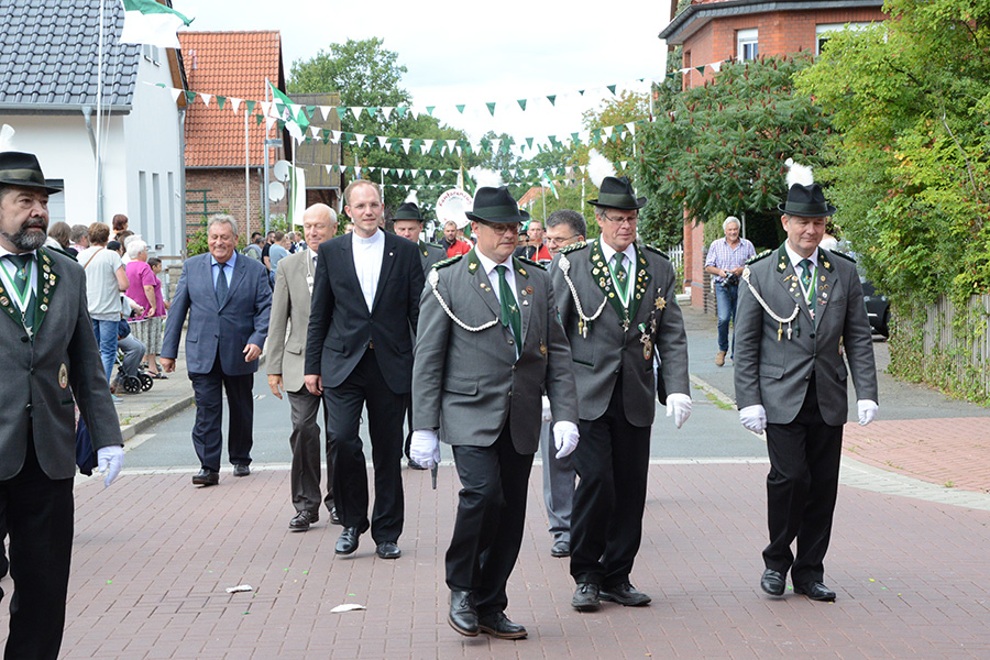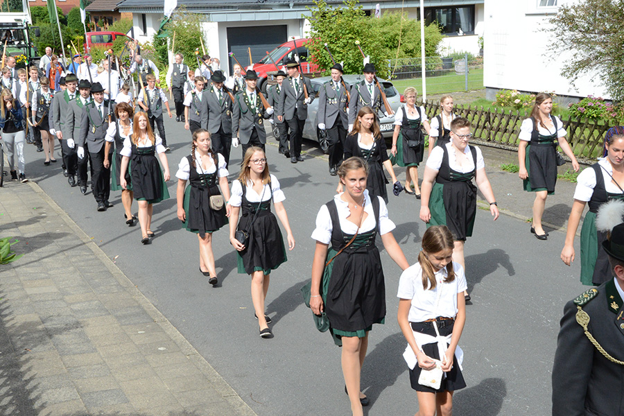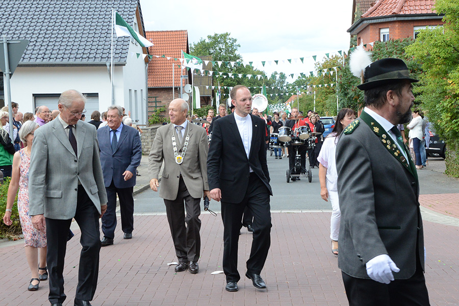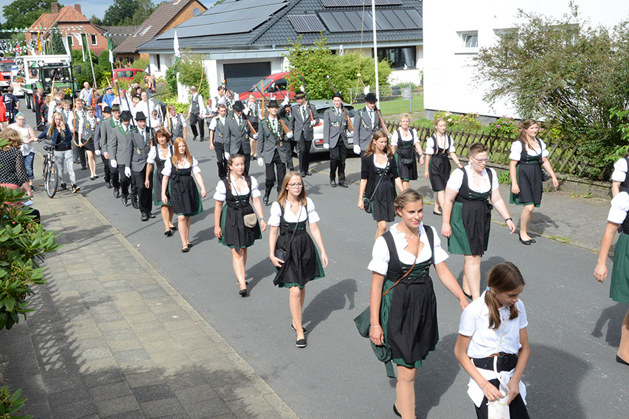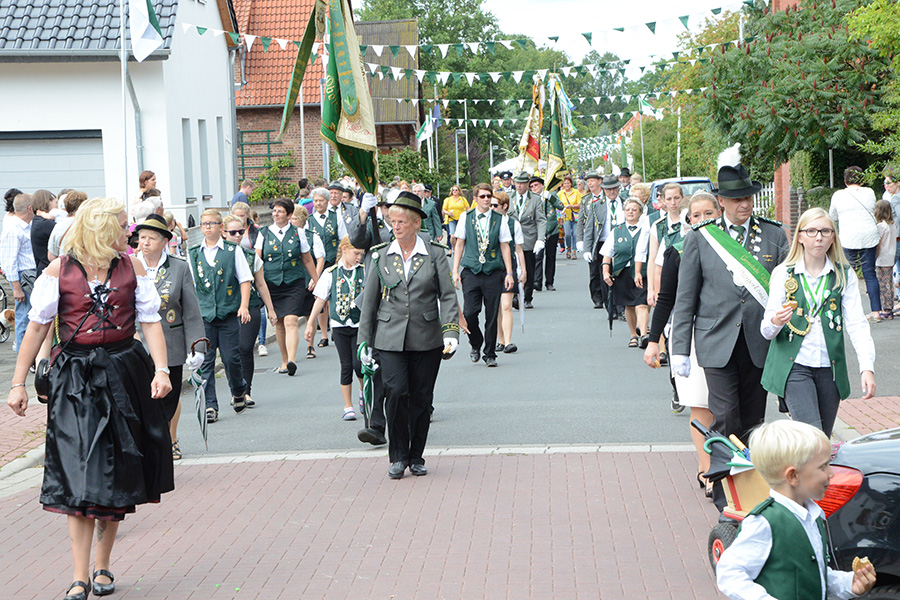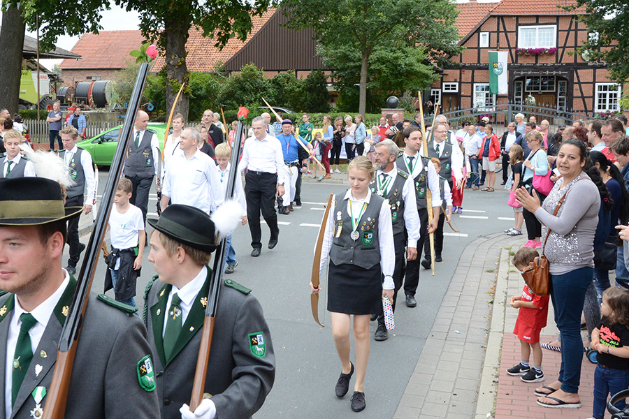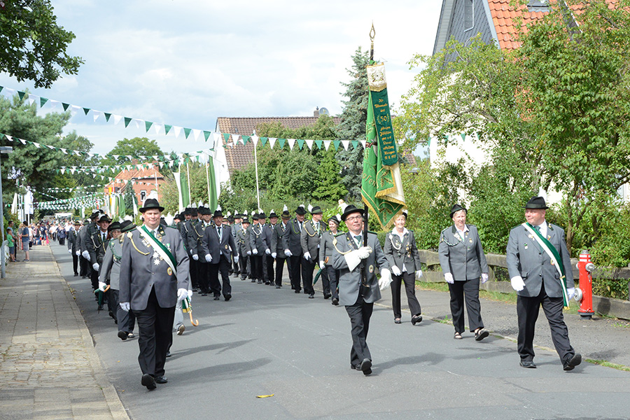 So verfolgten wieder hunderte Besucher den Festumzug und viele nahmen ein paar Meter Fußweg in Kauf, um den Festumzug noch ein weiteres Mal zu sehen, was einer kleinen Völkerwanderung gleich kam. So war die Kreuzung am Pappaul, wie auch die Henighuser Straße zwischen Breitenkampstraße und Windmühlenstraße besonders beliebte "Aussichtspunkte". Letzterer sogar doppelt, denn hier kam der Umzug zwei Mal vorbei. Da taten auch ein paar Tropfen Regen der Stimmung keinen Abbruch. Nach dem kleinen Schauer schaute sogar wieder Sonne durch die Wolken und begleitete schützen und ihre Gäste auf dem Weg zurück zum Festplatz.