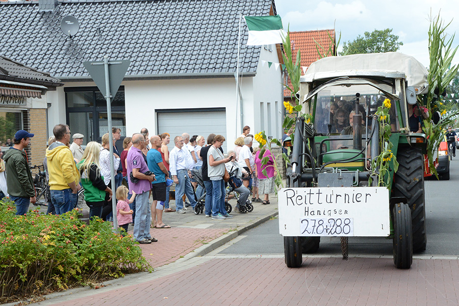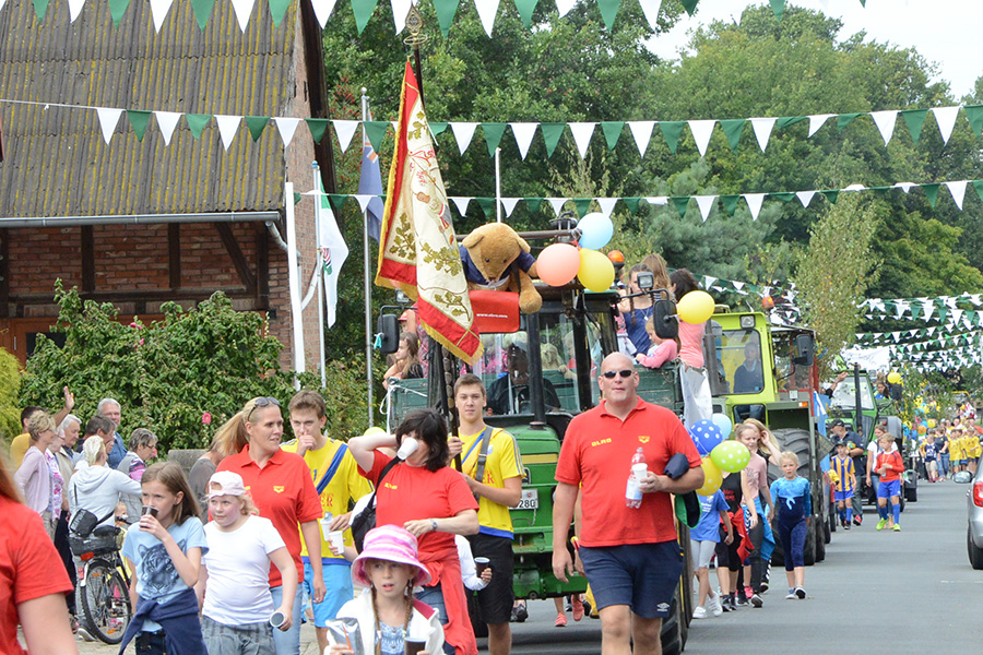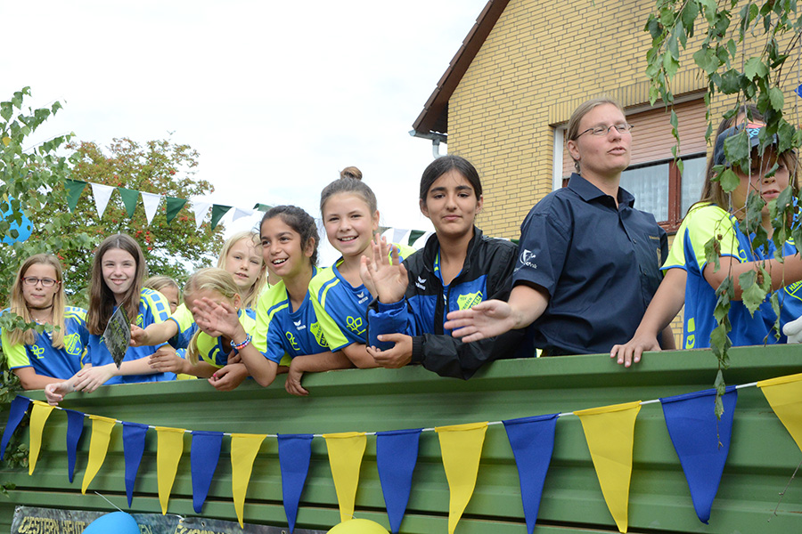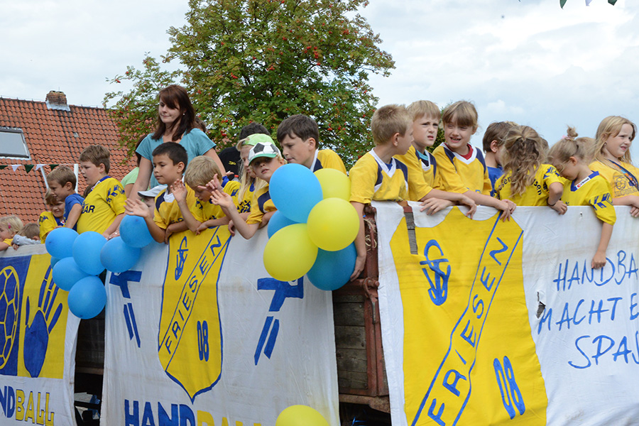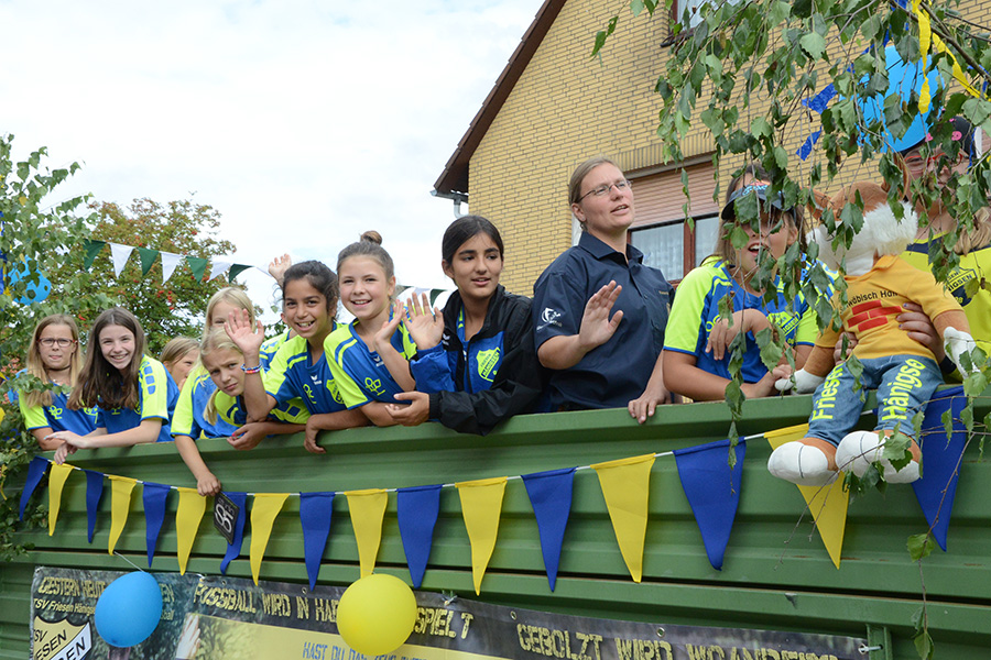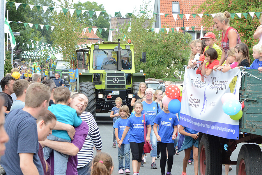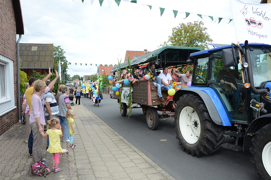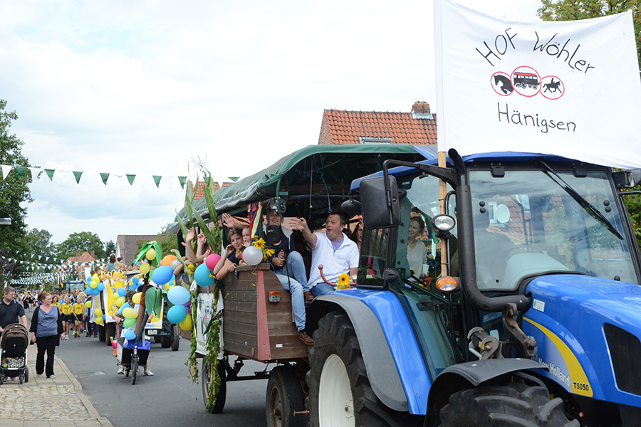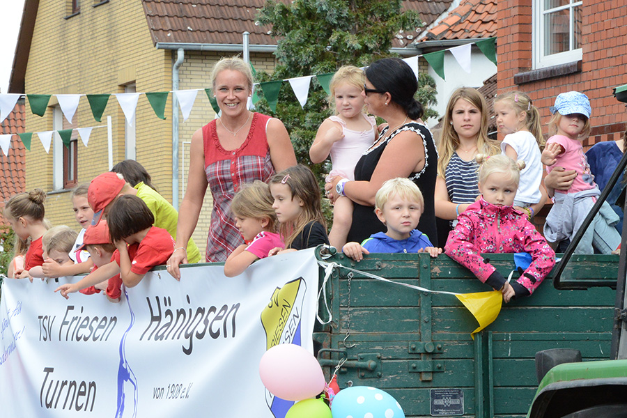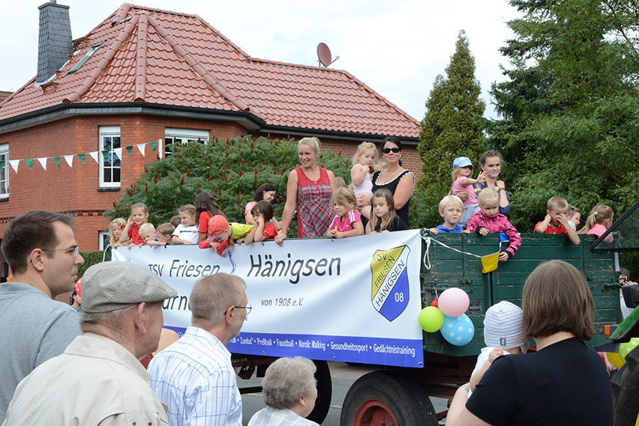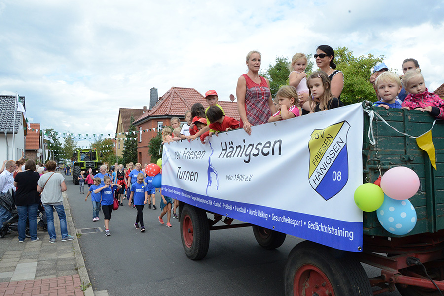 Aber auch aus dem Ort hatten sich wieder viele Vereine, Verbände und Organisationen angeschlossen. So waren die Kyffhäuser Kameradschaft, eine Abordnung des Gelben Hauses, der Sozialverband, das Freibad, die DLRG, das Studio S5, der Reitverein, die Jugendfeuerwehr, die Landjugend, Hof Wöhler und der Bergmannsverein mit Abordnungen vertreten. Das wohl größte Teilnehmerfeld stellte der TSV Friesen Hänigsen, der mit einigen Festwagen und den Sparten Fußball, Turnen, Handball und Baseball dabei war.