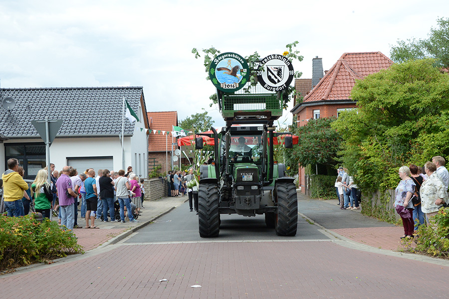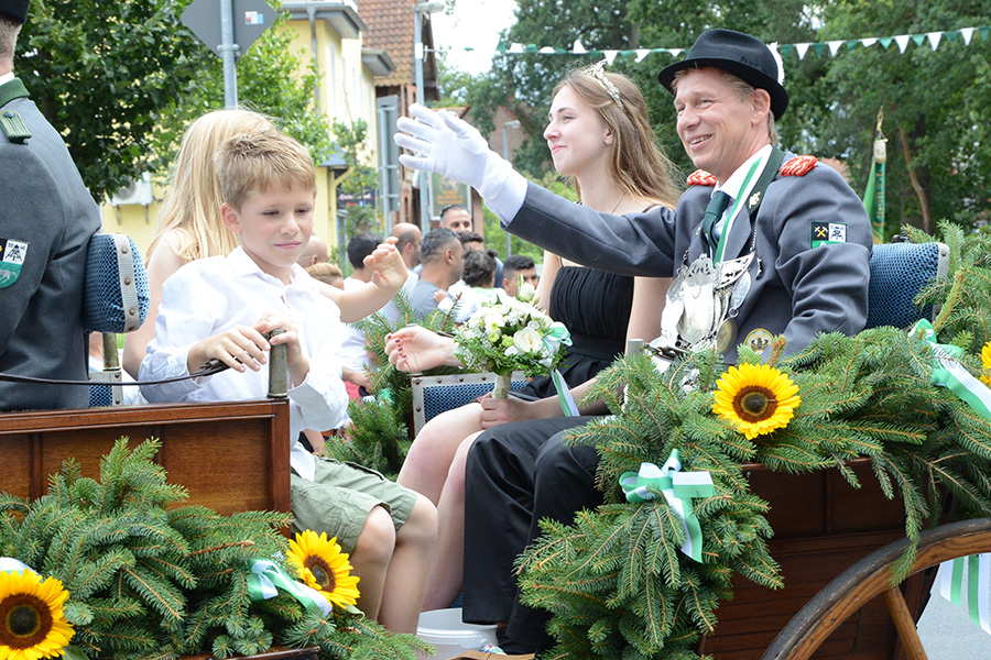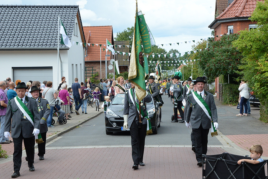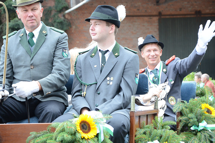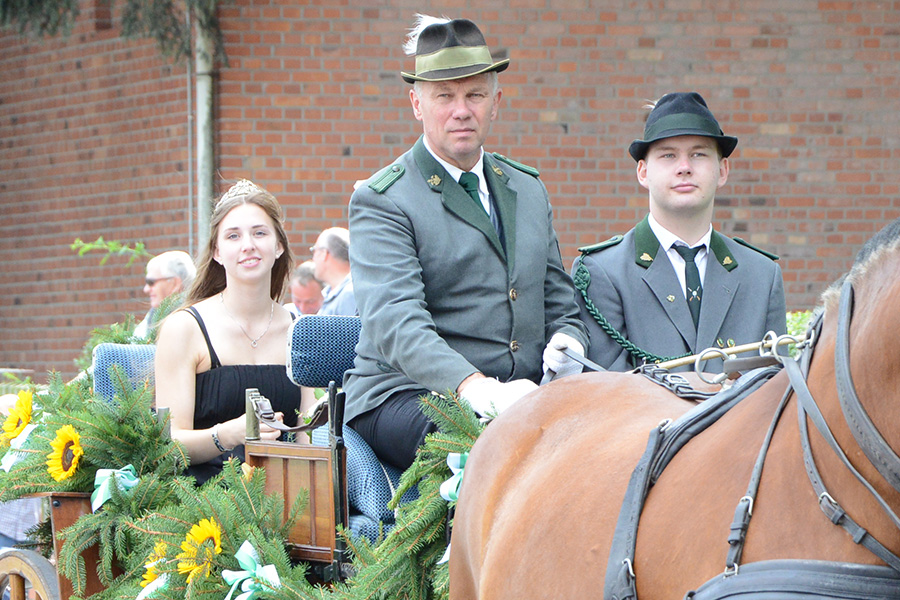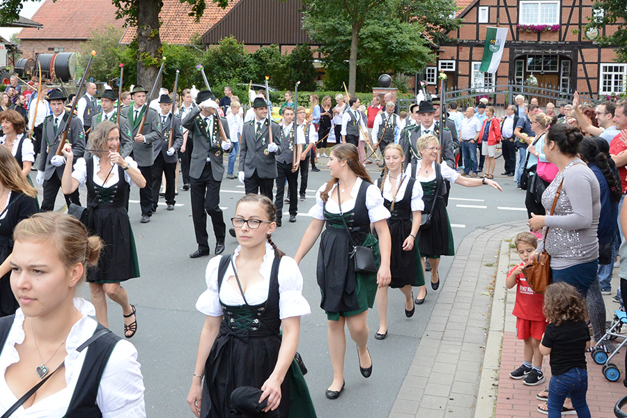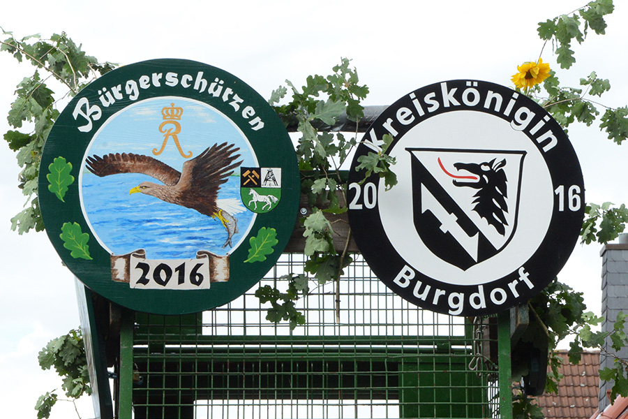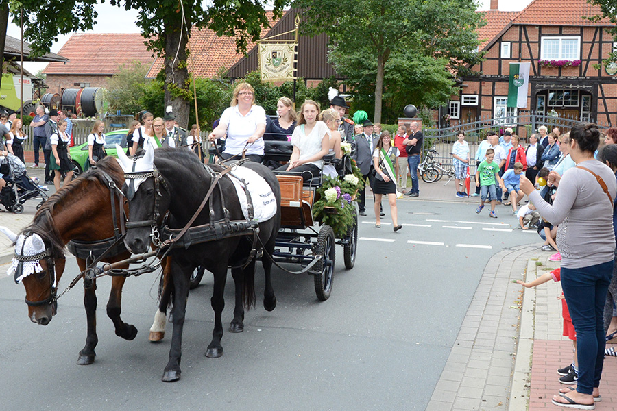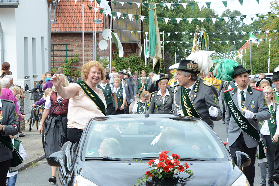 Hunderte Menschen säumten am heutigen Sonntag, 21. August 2016 die Straßen im Uetzer Ortsteil Hänigsen. Schon lange Zeit vor dem großen Festumzug anlässlich des Schützen- und Volksfestes des Bürgerschützenvereins Hänigsen (der AltkreisBlitz berichtete bereits über den Kommers am gestrigen Sonnabend) sicherten sich die Zuschauer die besten Plätze an den Straßen. Wer konnte, der machte es sich auch im Garten oder – noch besser – mit Stühlen und Tischen direkt an der Straße gemütlich, um den bunten Festumzug zu bewundern. Das geschulte Auge erkannte nach den Herolden sowie Oberst und Adjutant hoch zu Ross, gefolgt von weiteren Reitern des Reitvereins Hänigsen, auch gleich die erste Besonderheit des Hänigser festumzuges: Auf dem Scheibenwagen hing – neben der Scheibe des Bürgerschützenkönigs – eine zweite: Es ist die Scheibe der Kreiskönigin Heike Bade, die die höchste Königswürde des Kreisschützenverbandes (KSV) Burgdorf in diesem Jahr nach Hänigsen holte. Sie durfte, neben den vier Gepannen für den Bürgerschützenkönig Dirk Nissel, Jungschützenkönig Jonas Beneke, Kinderkönigin Hann Mundt und der Damenbesten Cindy Klüppel, wie auch Volkskönig Henning Meyer in einem Cabrio am Umzug teilnehmen.