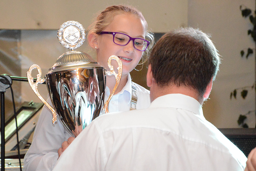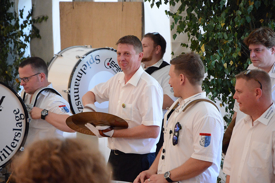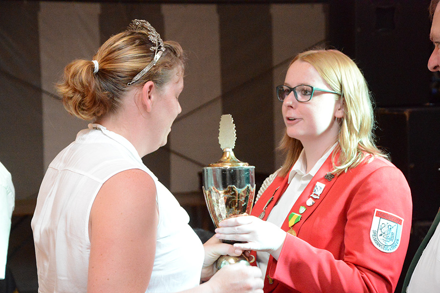 Pokale hatte auch der Spielmannszug zu verleihen. Nicht ohne aber auf den mittlerweile bedrohlichen Mitgliederschwund hinzuweisen. Denn es fehlen im Spielmannszug "drei Flöten und ein Becken" und nur durch zwei Aufrufe im Ort konnte der Auftritt beim Schützenfest gesichert werden. Daher galt der dringende Appell an Musiker, sich doch dem Spielmannszug anzuschließen. Der Wanderpokal des Spielmannszugs ging an Katharina Scharringhausen. Der 1000 Möglichkeiten-Pokal, der für besondere Verdienste verliehen wird, bekam Mirco Bätje überreicht, der seit 15 Jahren am Schützenfest-Freitag zum Eieressen einlädt (wie auch in der Nacht zu heute) und seit 25 Jahren im Spielmannzug die Becken erklingen lässt.
