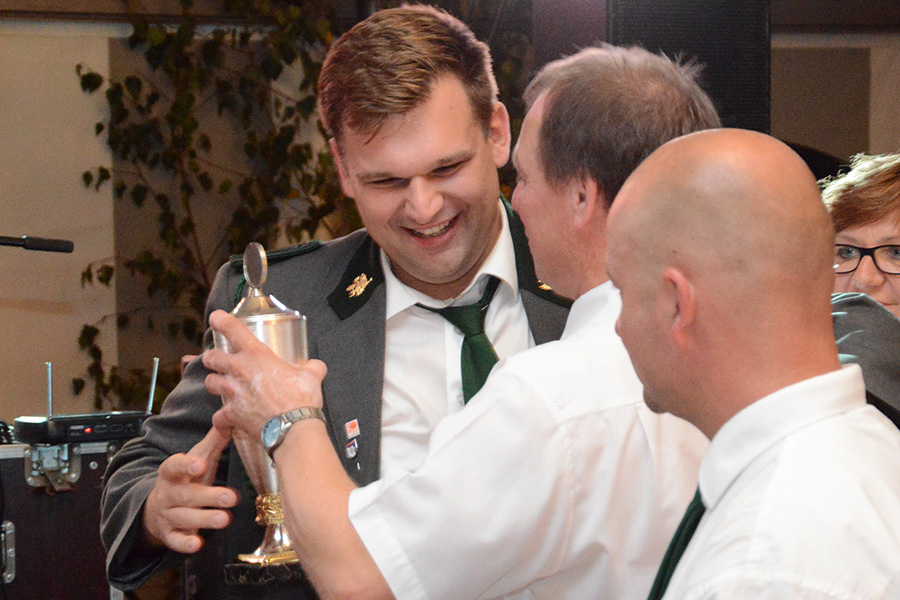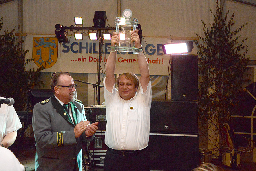 Bevor aber die neuen Majestäten proklamiert werden konnten, wurde der Gewinner eines besonderen Wanderpokals bekannt gegeben. Erstmals hatte das Schützenkollegium Burgdorf unter allen Burgdorfer Schützenvereinen einen Sieger ausgeschossen. Der SSV war erstmals Gastgeber und als Urs-Uwe Simanowsky vom Schützenkollegium bekannt gab, dass der Sieger aus Schillerslage kommt, brandete großer Jubel auf. Was er nicht verriet: Nicht nur der Gewinner, sondern die ersten sieben Plätze gingen nach Schillerslage. So nahm Jens Reupke als erster Sieger den Pokal in Empfang.