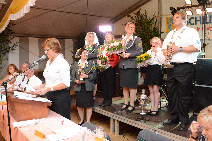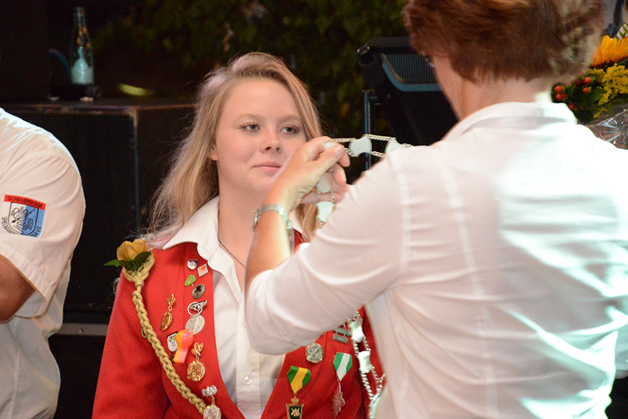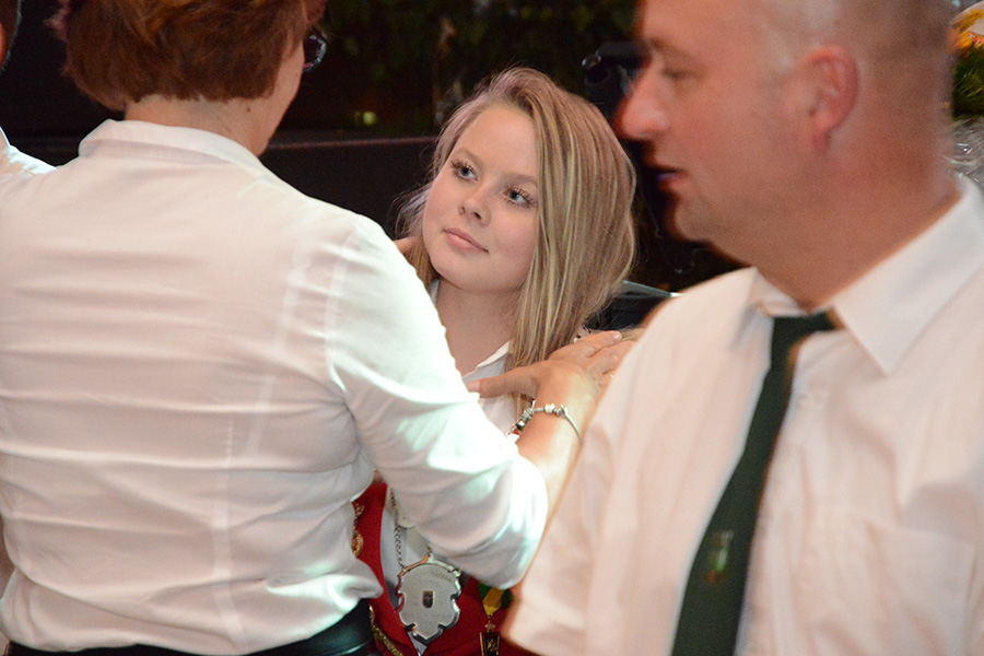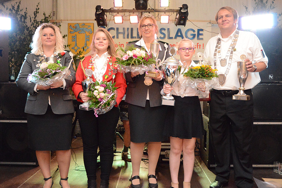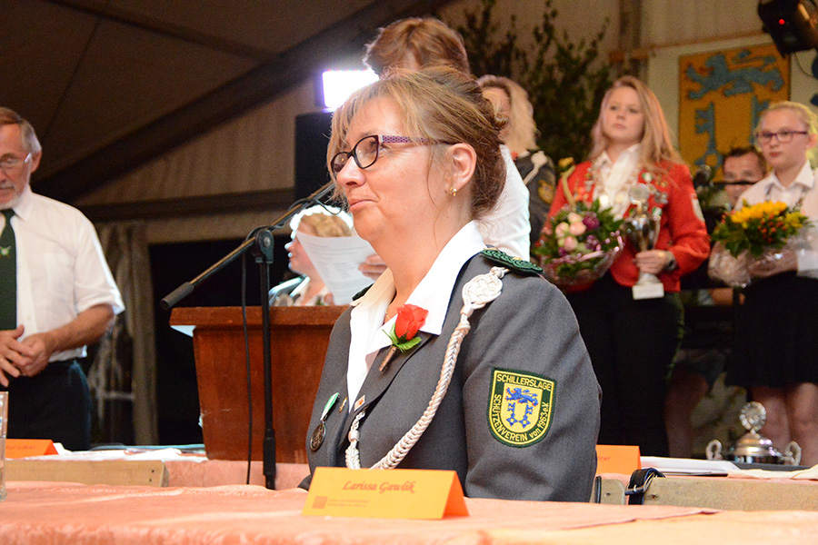 Diese ging wie immer unter einem Trommelwirbel für die Könige vonstatten, wenn auch die Namen schon bekannt waren. Neue Kinderkönigin wurde Larissa Gawlik und bei der Jugend setzte sich Michelle-Monique Schrödter durch, die zudem Winterjugendkönigin ist. Ihre Mutter Maike Schrödter wurde KK-Königin. Eine Konstellation, die die beiden schon einmal hatten: Vor fünf Jahren wurde Maike Schrödter Schützenkönigin, ihre Tochter Kinderkönigin. Die KK-Königin hatte jedoch keinen KK-König an ihrer Seite am Königstisch sitzen. Dieser Platz blieb leer, wie später noch aufzulösen war. Den Titel der Damenkönigin sicherte sich Britta Lohmann, die die Glückwünsche der Damenabteilung Glückwünsche in Form eines Ständchens überbracht bekam. Einen KK-König hatten die Schillerslager natürlich auch ausgeschossen, auch wenn dieser nicht an seinem Platz saß: Jens Reupke, schon Gewinner der Wanderpreises des Schützenkollegiums, hatte sich beim Schießen mit dem Kleinkalibergewehr durchgesetzt und bekam so die Kette umgehängt. Er wird diesen "Job" jedoch nur in Teilzeit nachgehen können, denn er bekam zusätzlich noch die Königskette überreicht und saß deshalb in der Mitte des Königstisches, wie es sich für einen König gehört.