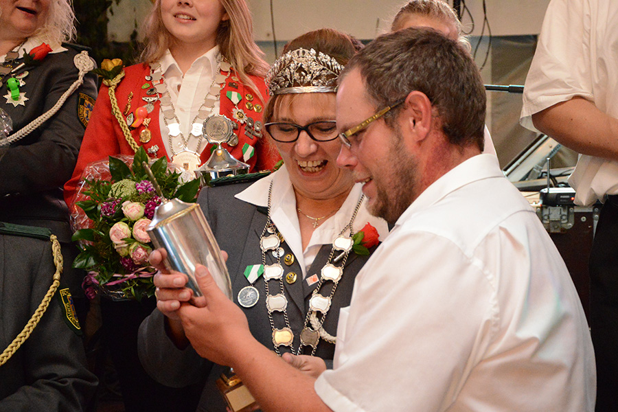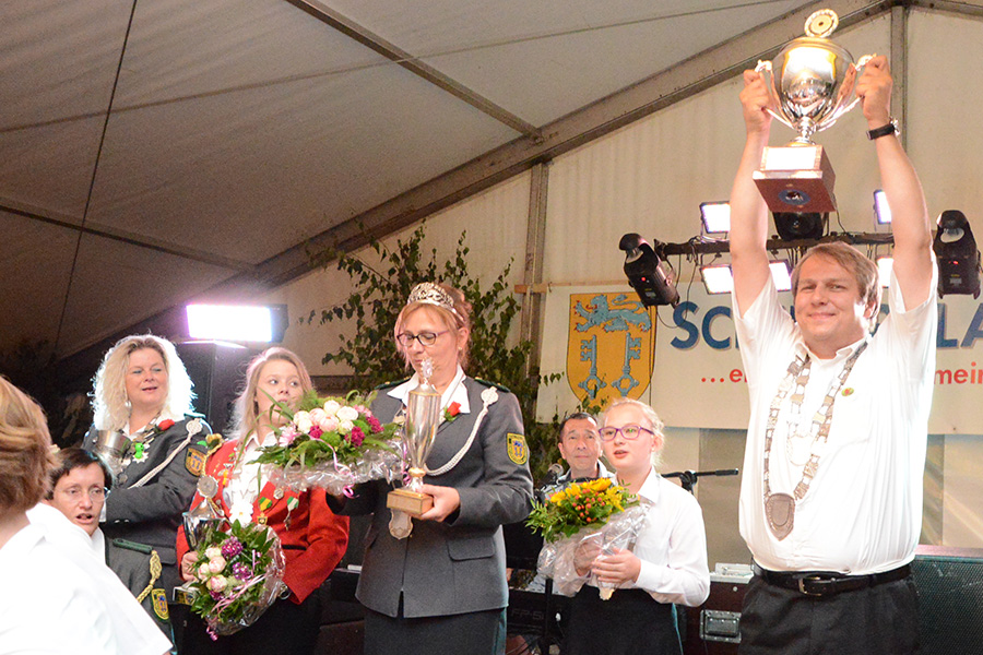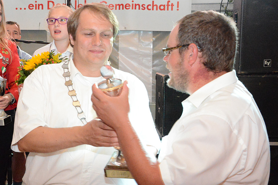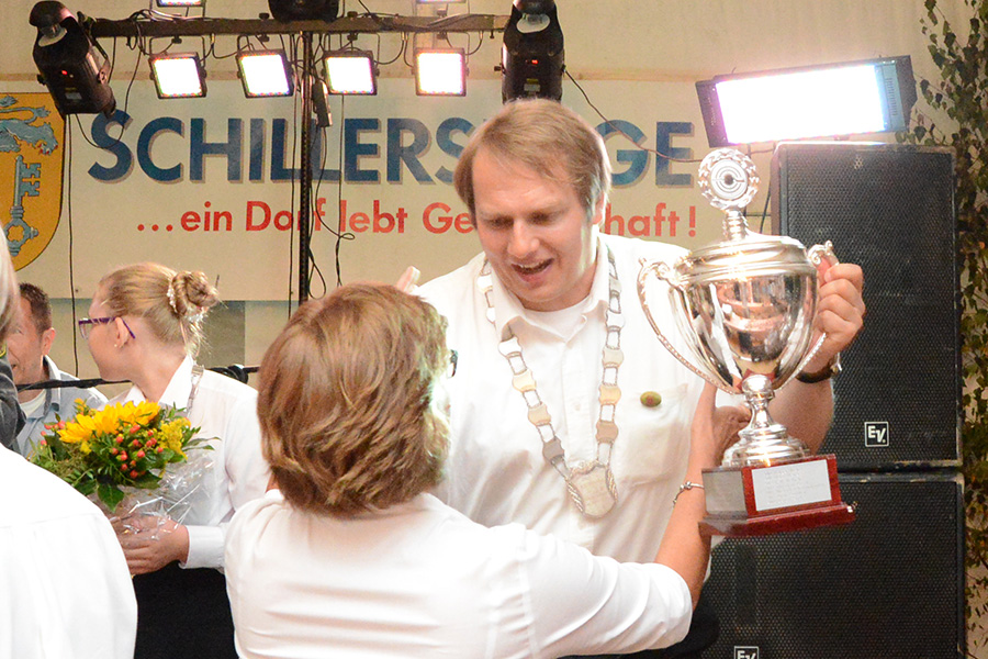 Bevor aber die neuen Majestäten proklamiert werden konnten, wurde der Gewinner eines besonderen Wanderpokals bekannt gegeben. Erstmals hatte das Schützenkollegium Burgdorf unter allen Burgdorfer Schützenvereinen einen Sieger ausgeschossen. Der SSV war erstmals Gastgeber und als Urs-Uwe Simanowsky vom Schützenkollegium bekannt gab, dass der Sieger aus Schillerslage kommt, brandete großer Jubel auf. Was er nicht verriet: Nicht nur der Gewinner, sondern die ersten sieben Plätze gingen nach Schillerslage. So nahm Jens Reupke als erster Sieger den Pokal in Empfang.