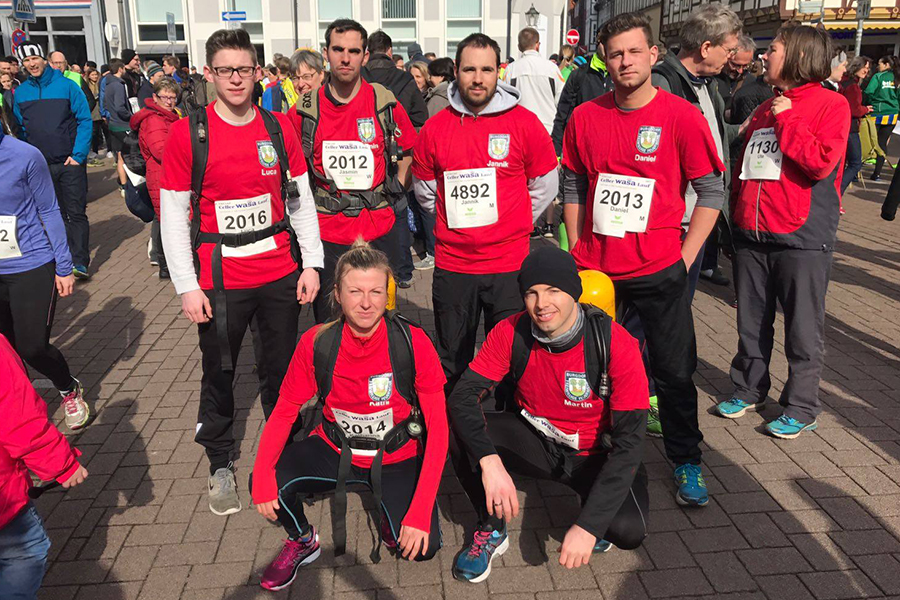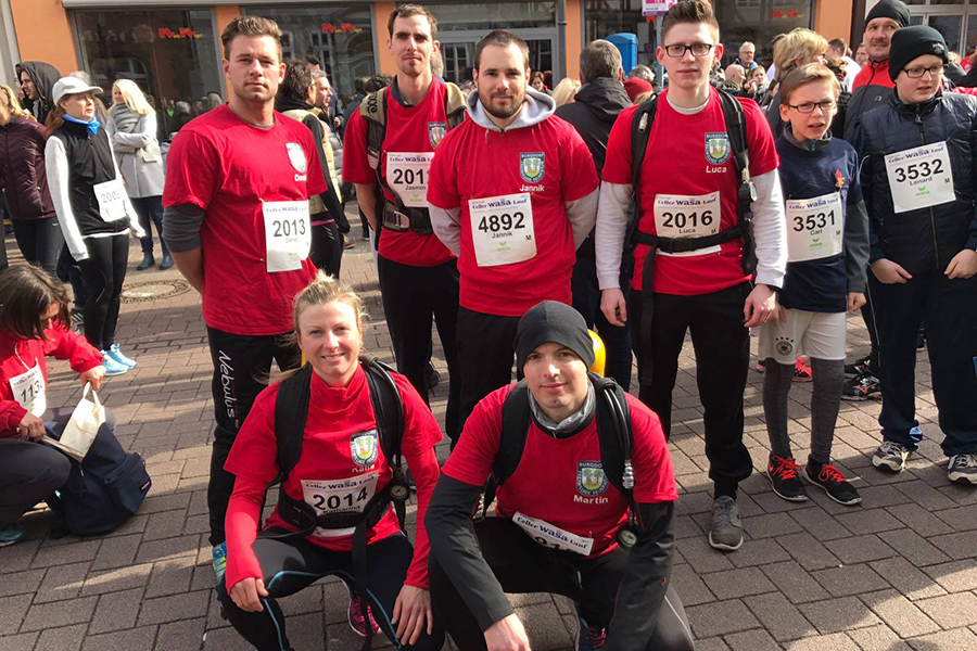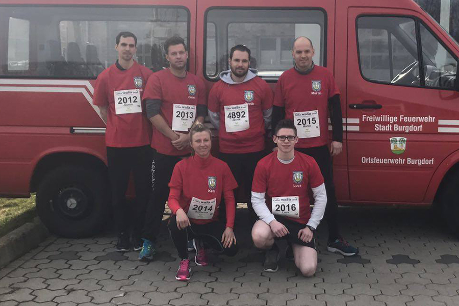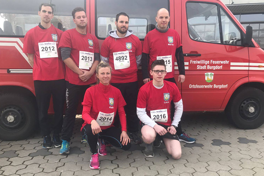 Dass Feuerwehrmitglieder nicht nur Brände löschen sondern auch laufen können, haben am vergangenen Sonntag, 13. März 2017, sechs Mitglieder der Freiwilligen Feuerwehr Burgdorf gezeigt, die zur Laufgruppe innerhalb der Ortswehr gehören. Wie schon beim Spargellauf im vergangenen Jahr in Burgdorf trat die Vertretung der Burgdorfer Ortswehr beim beim 35. Celler Wasa-Lauf nicht nur in einheitlichen Shirts an, sondern vier Mitglieder liefen die Strecke über 5 Kilometer mit den im Brandeinsatz üblichen Atemluftflaschen aus Stahl. Mehr als 10 Kilogramm zusätzlich hatten sie dabei auf dem Rücken über die Strecke zu transportieren. Ein Feuerwehrmitglied hat zudem die Strecke über 10 Kilometer gemeistert. Dass bei einer solchen Herausforderung nicht die Zeit zählt, sondern der olympische Gedanke "dabei sein ist alles", versteht sich von selbst.