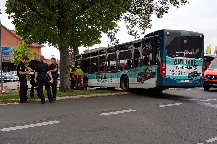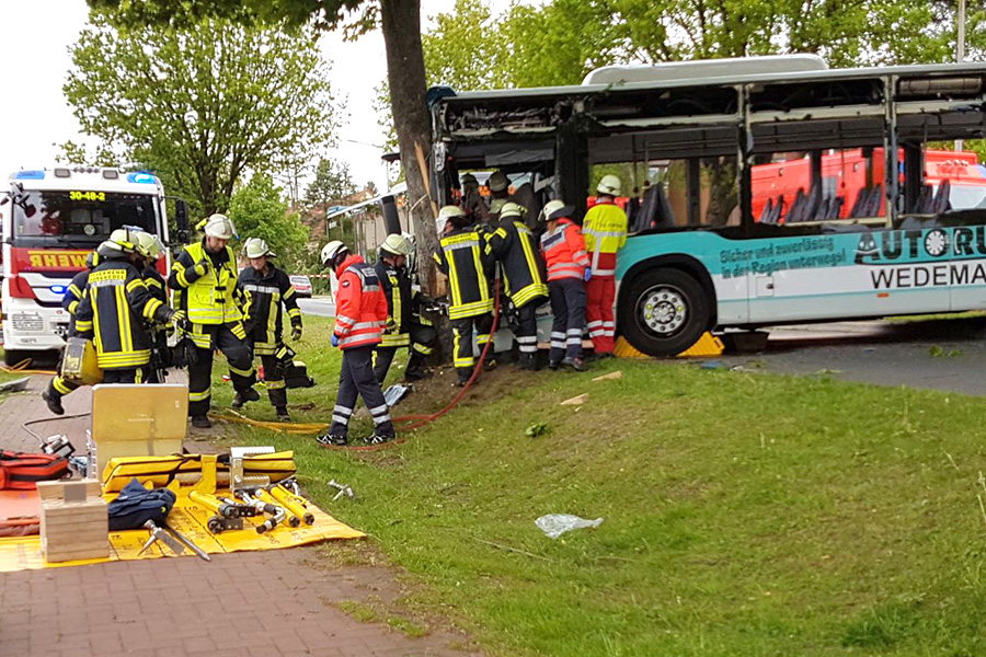 Zu einem schweren Verkehrsunfall ist es am heutigen Dienstag, 16. Mai 2017, gegen 13:30 Uhr am Schulzentrum in Großburgwedel gekommen. Aus noch nicht geklärter Ursache war ein Bus von der Fahrbahn angekommen, hat einen weiteren Bus gestriffen, wobei die Scheiben auf der linken Seite alle geborsten sind und ist anschließend mit hoher Geschwindigkeit frontal gegen einen Baum geprallt. Die Rettungskräfte sind derzeit vor Ort, für die Helfer der Freiwilligen Feuerwehr Großburgwedel wurde Vollalarm mit Sirene ausgelöst. 19 Einsatzkräfte rückten umgehend mit vier Fahrzeugen aus. Zum Zeitpunkt des Unglücks befand sich nach ersten unbestätigten Angaben nur ein Fahrgast in dem Bus, der unverletzt geblieben sein soll. Die Einsatzkräfte der Feuerwehr haben den eingeklemmten Fahrer mit hydraulischen Rettungsgerät dem Bus befreien können. Bislang liegen keine Informationen über seinen Zustand vor. Die Hannoversche Straße am Schulzentrum wird vermutlich auch noch länger gesperrt sein, da Betriebsstoffe ausgelaufen sind. Wir berichten, sobald wir weitere Informationen haben.