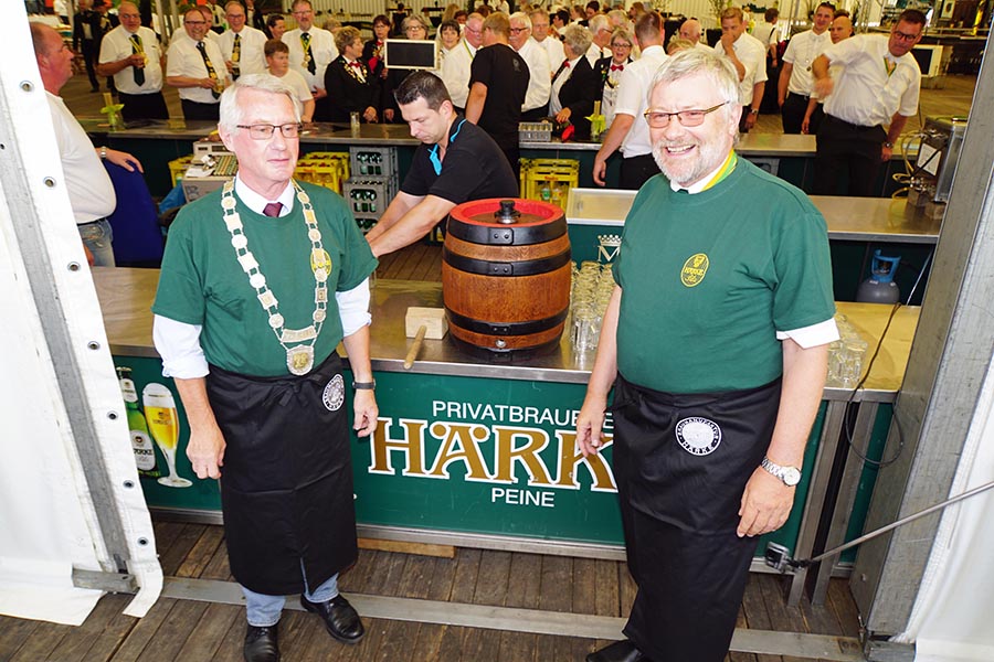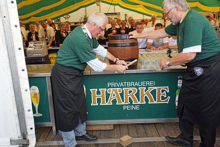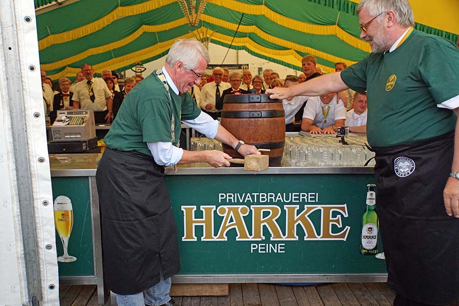 Die kleine Malaise, das der Hammerkopf beim dritten Schlag vom Stiel flog, haben die beiden Herren souverän gelöst; kein Tropfen Bier ging verloren. Assistiert von weiteren MitgliederInnen der Burgdorfer Schützen konnten Alfred Baxmann und Jörg Hoppe somit das gesamte Fass an Burgdorfs Bürger ausschenken und verteilen.