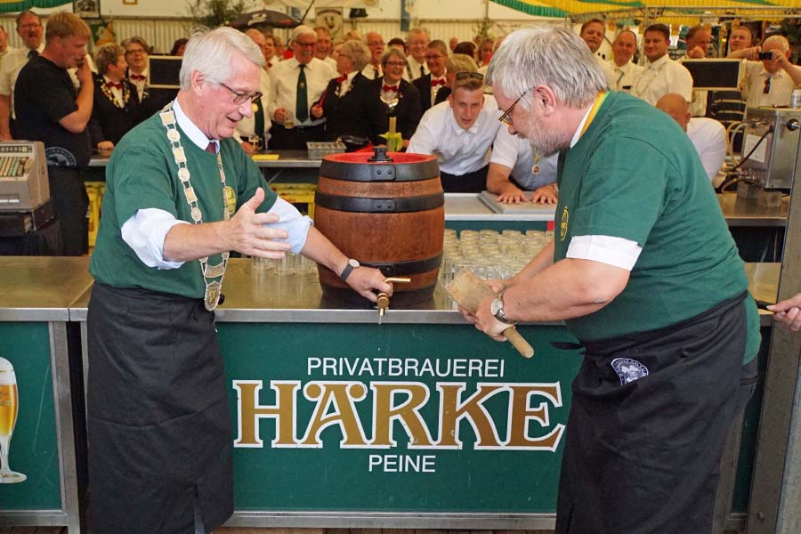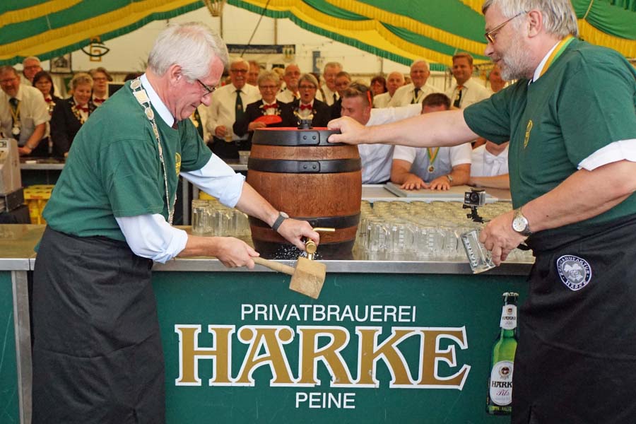 Ausgerüstet mit Bierschürze, Amtskette, zu der Musik des Spielmannszug Burgdorf und unterstützt von Jörg Hoppe, 1. Vorsitzender der Burgdorfer Schützengesellschaft, brauchte Burgdorfs Bürgermeister Alfred Baxmann acht Hammerschläge auf den Bierhahn, um 18:34 Uhr am heutigen Donnerstag, 22. Juni 2017, traditionell die offizielle Eröffnung des Burgdorfer Schützenfest 2017 mit dem ersten gefüllten Bierseidel zu verkünden.