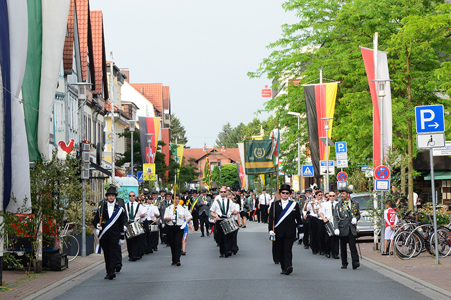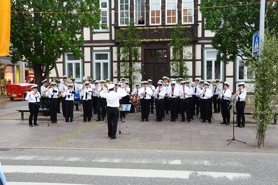 Vor dem Rathaus hatte sich zu dieser Zeit schon mehr als 200 Besucher eingefunden, die einerseits auf den Großen Zapfenstreich warteten, andererseits der schmissigen Musik des Feuerwehrmusikzuges der Feuerwehren Burgdorf und Hänigsen lauschten. Hie rund da waren schon die ersten zu sehen, die anfingen zu tanzen. Man merkt: Das Burgdorfer Schützenfest hat begonnen.