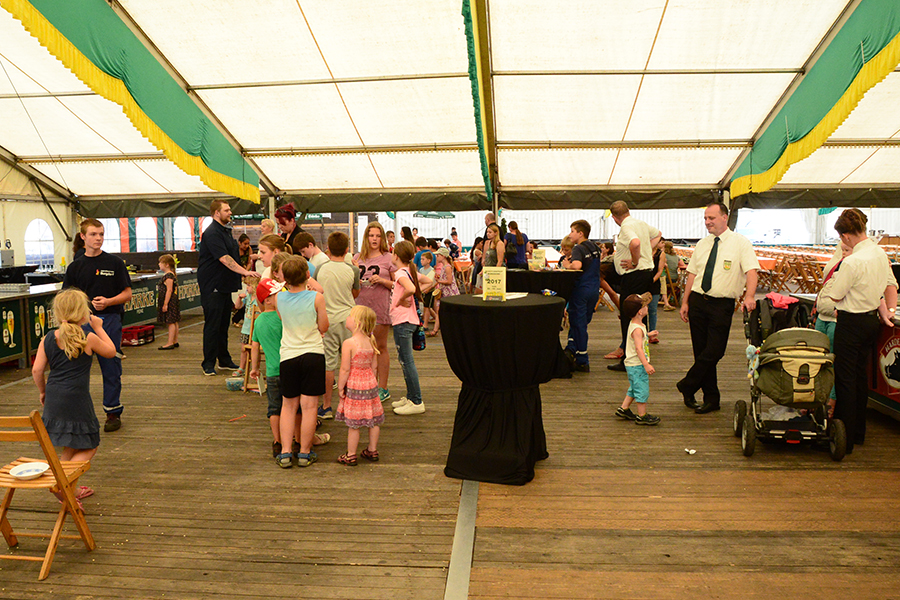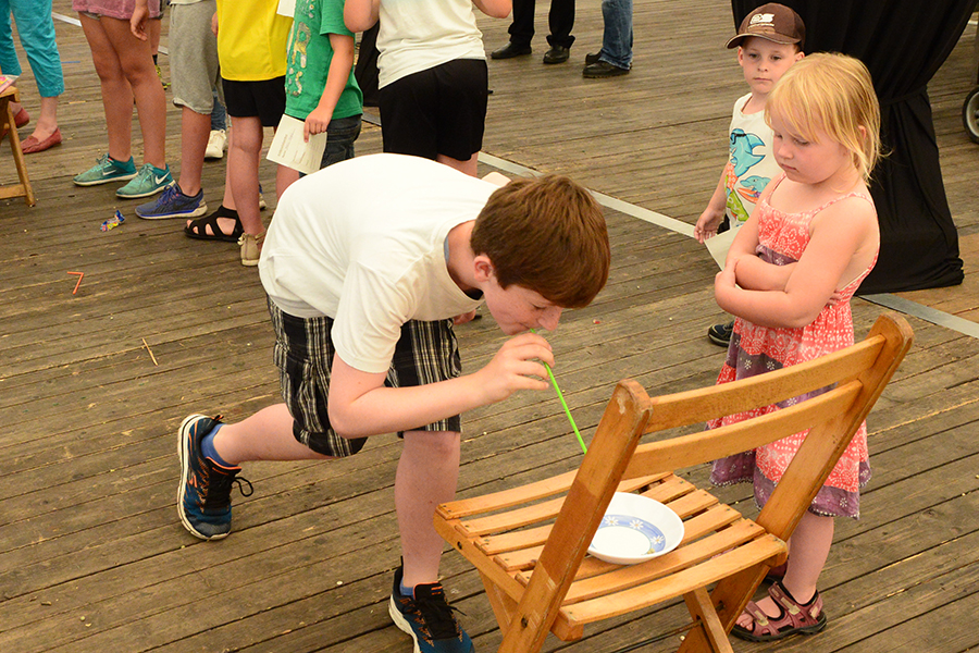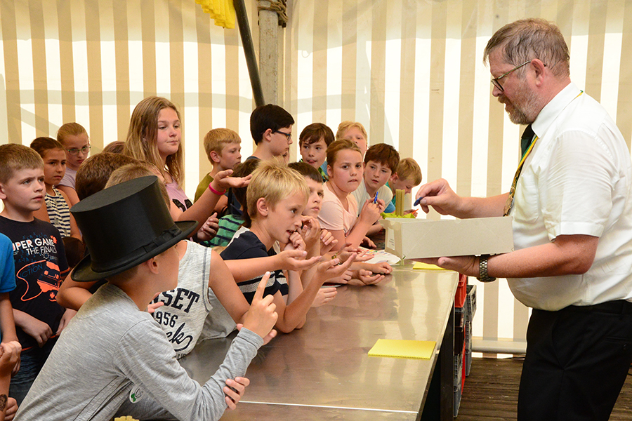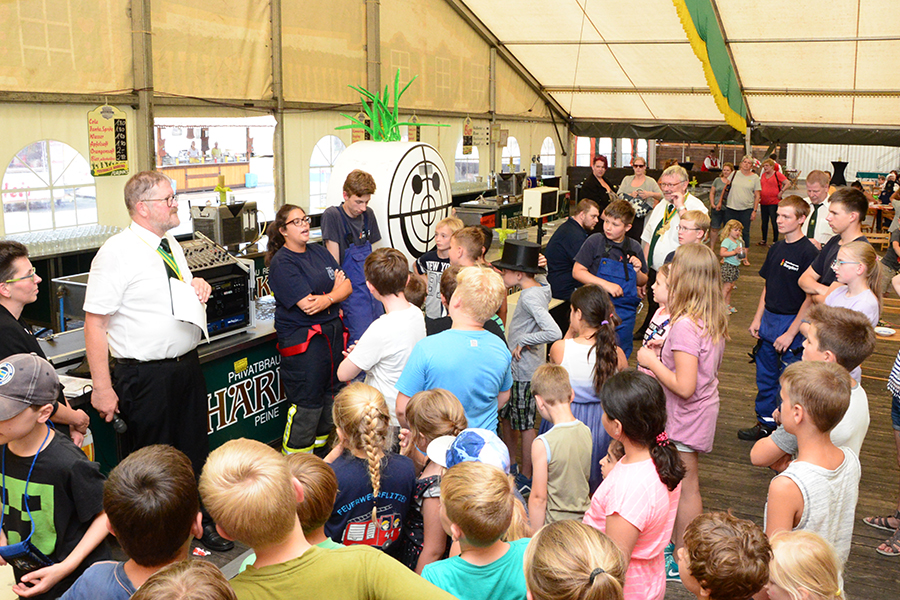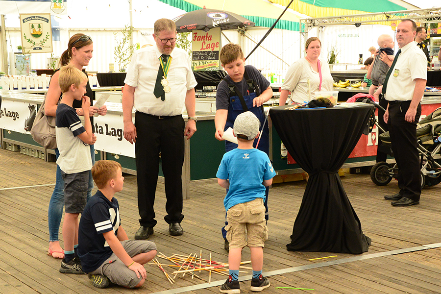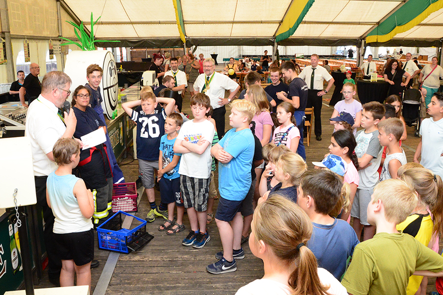 In diesem Jahr zeichnete sich die Kinderfeuerwehr – die Feuerwehrflitzer 41 – für die Gestaltung des Nachmittags verantwortlich. Kinderfeuerwehrwartin Florentine Hoffmann hatte zwei Betreuer sowie auch sechs Mitglieder der Jugendfeuerwehr – nebst Löschfahrzeug neben dem Zelt – mitgebracht, um den Kindern einen lustigen Nachmittag zu bieten. Ob mit einem Strohhalm Erbsen transportieren, Stiefelzielwurf, das Schätzen von Bonbons in einem Eimer oder ein Riesenmikado: An allen Stationen war sichtlich zu erkennen, dass die Kinder ihren Spaß hatten. Aufgrund der Unwetterwarnung musste lediglich das Feuerhaus leider im Fahrzeug verstaut bleiben, welches als weitere Station vor dem Zelt geplant war. Aufgrund der hochsommerlichen Temperaturen im Zelt wäre das Wasserspiel sicherlich erfrischend gewesen.