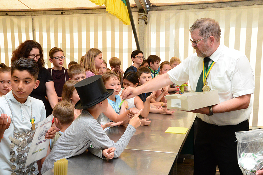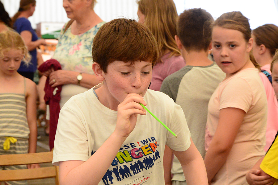 In diesem Jahr zeichnete sich die Kinderfeuerwehr – die Feuerwehrflitzer 41 – für die Gestaltung des Nachmittags verantwortlich. Kinderfeuerwehrwartin Florentine Hoffmann hatte zwei Betreuer sowie auch sechs Mitglieder der Jugendfeuerwehr – nebst Löschfahrzeug neben dem Zelt – mitgebracht, um den Kindern einen lustigen Nachmittag zu bieten. Ob mit einem Strohhalm Erbsen transportieren, Stiefelzielwurf, das Schätzen von Bonbons in einem Eimer oder ein Riesenmikado: An allen Stationen war sichtlich zu erkennen, dass die Kinder ihren Spaß hatten. Aufgrund der Unwetterwarnung musste lediglich das Feuerhaus leider im Fahrzeug verstaut bleiben, welches als weitere Station vor dem Zelt geplant war. Aufgrund der hochsommerlichen Temperaturen im Zelt wäre das Wasserspiel sicherlich erfrischend gewesen.