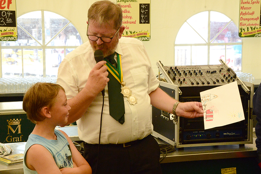 Einen Sonderpreis wurde dann noch von der Schützengesellschaft ausgelobt: Das beste Feuerwehrbild gewann einen Preis. An einem separaten Tisch konnten die Kinder nach Herzenslust malen. Das beste Bild hatte Julian Leibgan gemalt. Ein Feuerwehrauto mit einem Feuerwehrmann, der ein brennendes Haus löscht. "Das ist auch sehr wichtig, dass die Feuerwehr kommt, wenn ein Haus brennt", erkannte auch Schützenkommandeur Rolf Hoppe, der zusammen mit Cathrin Eichner den Nachmittag begleitete. "Zudem scheint auf dem Bild auch noch die Sonne", zeigte er die Vorzüge des Bildes an, das durch die Jury ausgewählt wurde.