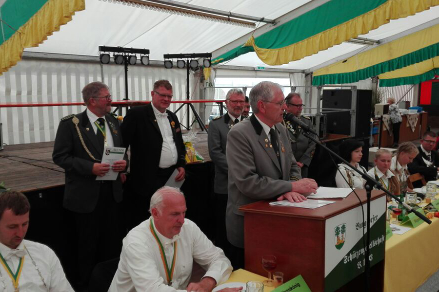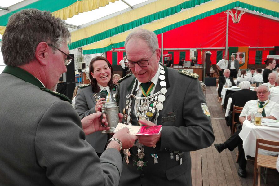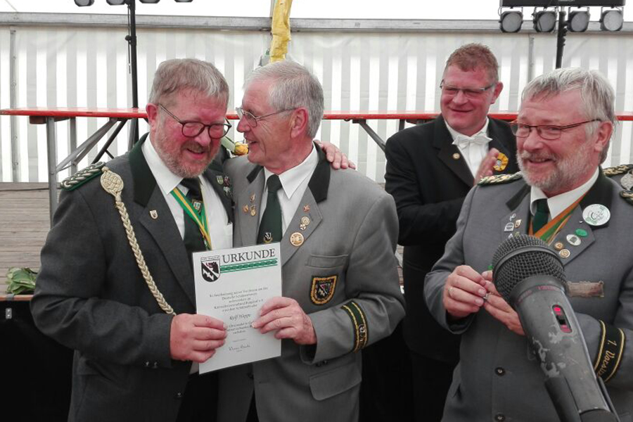 Am heutigen Freitag, 23. Juni 2017, wurde ihm nun für sein langjähriges ehrenamtliches Engagement eine besondere Ehre zu Teil: Er wurde vom Präsidenten des KSV, Werner Bösche, mit der Goldenen Ehrennadel des KSV geehrt. "Er wusste davon nichts", erklärt sein Bruder Jörg Hoppe, der 1. Vorsitzender der Burgdorfer Schützen ist, das überraschte Gesicht, als Rolf Hoppe nach vorne gebeten wurde. Als dann noch die rund 200 Gäste, die anlässlich der Siegerehrung der Schießwettbewerbe im Zelt waren, laut zu Standing Ovations skandierten "Ohne Rolle wäre hier nichts los", packten auch den Kommandeur die Emotionen, so dass kleine Freudentränen liefen. Sichtlich gerührt nahm er seine Ehrung entgegen.
