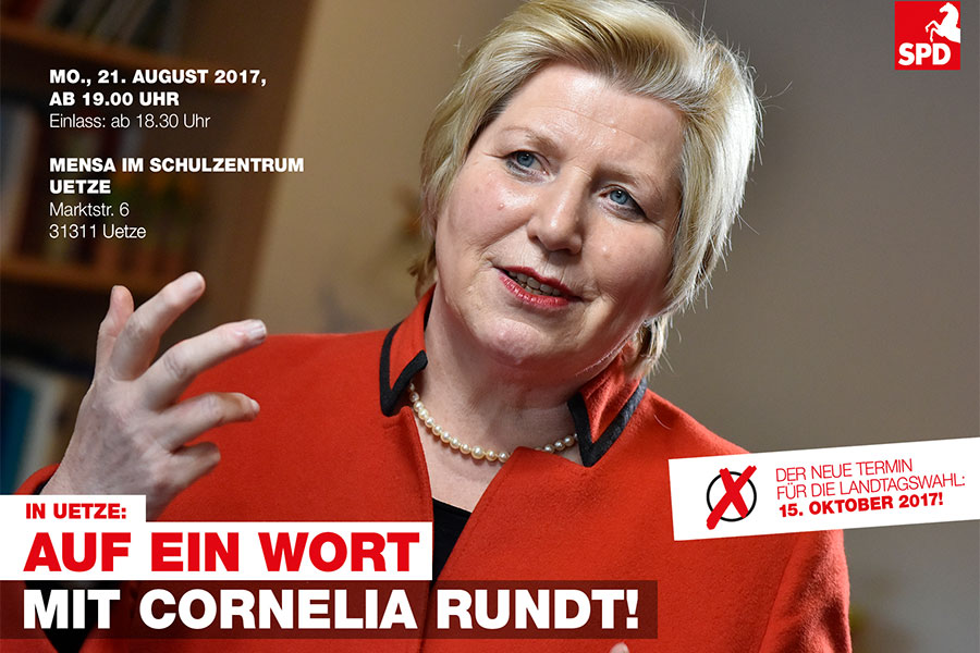 Der SPD-Bundestagsabgeordnete Matthias Miersch lädt in der kommenden Woche die Bürgerinnen und Bürger seines Wahlkreises zu einer Dialogveranstaltung mit der SPD-Sozialministerin Cornelia Rundt ein. Alle Interessierten sind herzlich eingeladen, in ungezwungener Atmosphäre mit den beiden Politikern in einen direkten Austausch zu treten und ihre gesammelten Fragen am kommenden Montag, 21. August 2017 ab 19:30 Uhr, in der Mensa im Schulzentrum Uetze, Marktstraße 6, zu stellen. Einlass ist ab 18:30 Uhr.