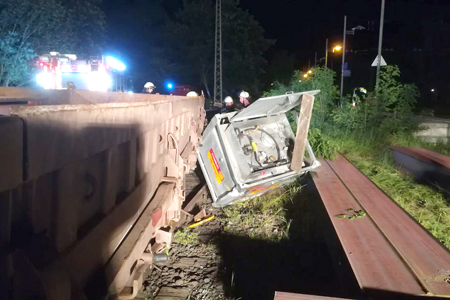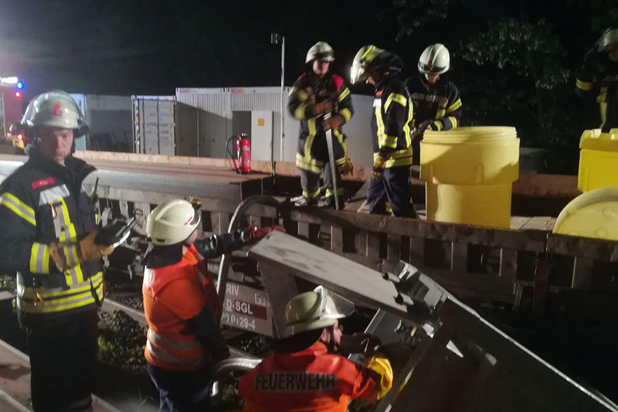 Ist ein umgestütrzter Bagger mitten in der Nacht schon ungewöhnlich, so stellte sich die Einsatzlage der sieben Einsatzkräfte der Ortswehr, die mit zwei Fahrzeugen ausgerückt waren, dann doch noch anders dar. Am Ende eines Abstellgleises der Bahnanlage war ein mit Stahlträgern beladener Waggon gegen eine in die Gleisanlage ragende mobile Tankanlage gestoßen. Die Tankanlage mit rund 300 Litern Dieselkraftstoff verkeilte sich mit dem Waggon, der zudem aus dem Gleisen sprang, und blieb seitlich gekippt verkeilt liegen.
