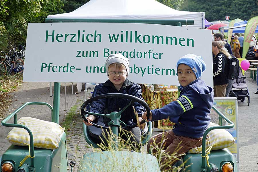Der Willkommensgruß am Eingang des letzten Pferdemarktes 2018, in "Person" eines historischen Traktors, bot ein sicherlich ungeplantes aber gern genutztes Kinderprogramm, wie Finn Christian (2,5 Jahre) aus Hülptingsen und Timo (3 Jahe) aus Burgdorf es augenscheinlich nutzten.