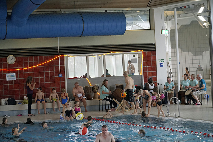 Bei dem Konzert der Trommelgruppe des JohnnyB. an der Rutsche des Hallenbades erlebten die Zuhörer mitreißende Trommel-Rhythmen aus Afrika. Auf keinem anderen Kontinent gibt es eine vergleichbare Vielfalt an verschiedenen Trommelinstrumenten und rhythmischen Ausdrucksformen. Das von Papy Lunguangu geleitete Percussion-Ensemble trägt seit neuestem den Namen "Ngoma Afrika" und gehört der Musiksparte des Fördervereins Kultürchen e.V. an.