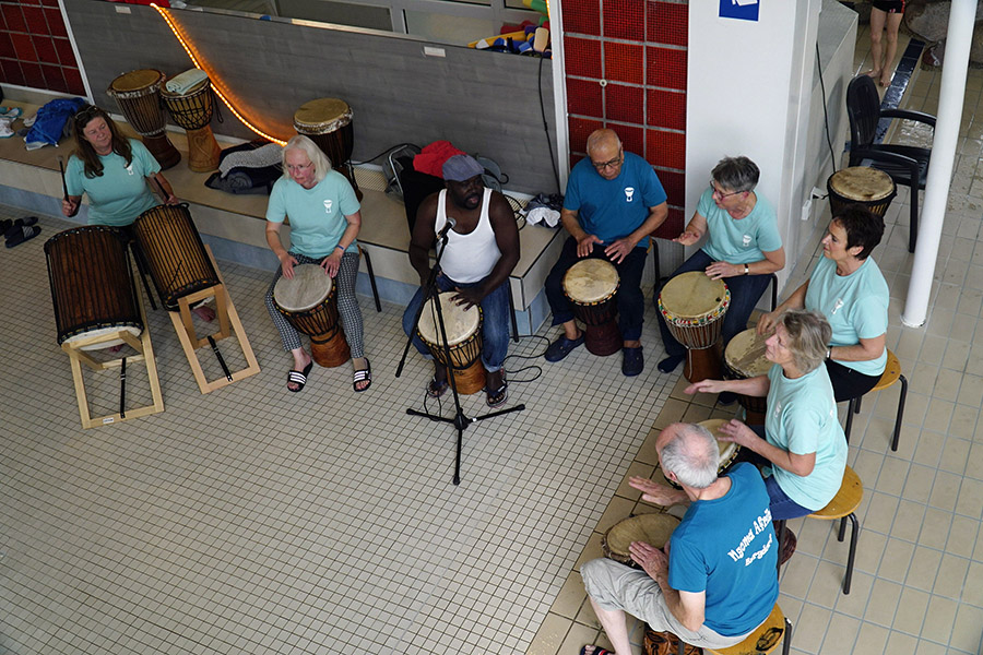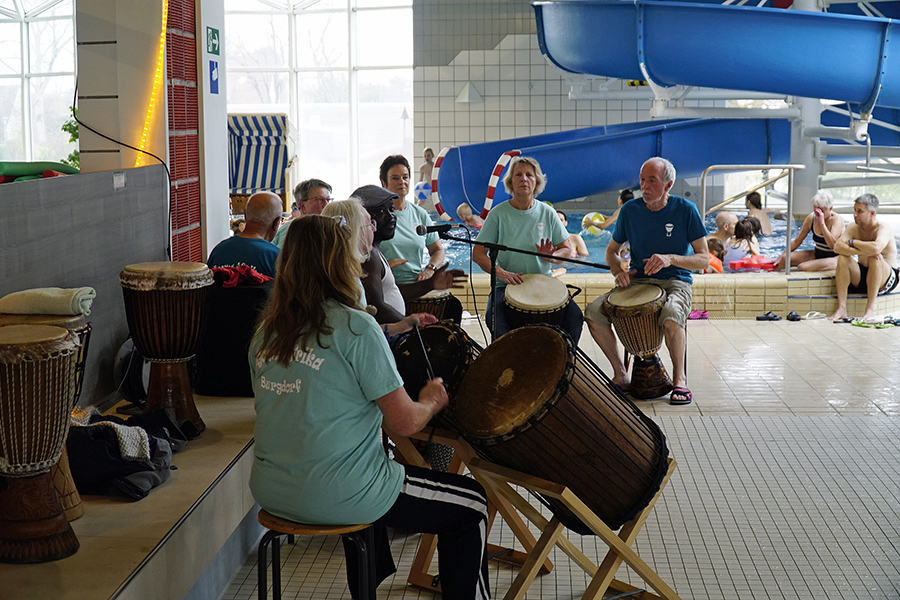 Bei dem Konzert der Trommelgruppe des JohnnyB. an der Rutsche des Hallenbades erlebten die Zuhörer mitreißende Trommel-Rhythmen aus Afrika. Auf keinem anderen Kontinent gibt es eine vergleichbare Vielfalt an verschiedenen Trommelinstrumenten und rhythmischen Ausdrucksformen. Das von Papy Lunguangu geleitete Percussion-Ensemble trägt seit neuestem den Namen "Ngoma Afrika" und gehört der Musiksparte des Fördervereins Kultürchen e.V. an.