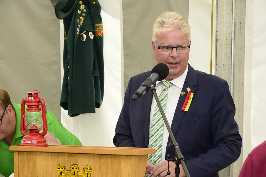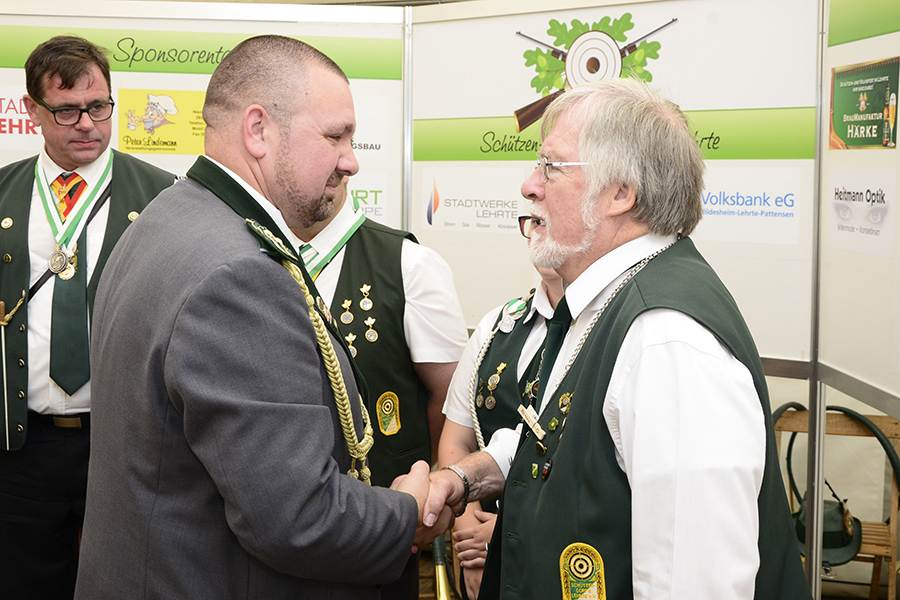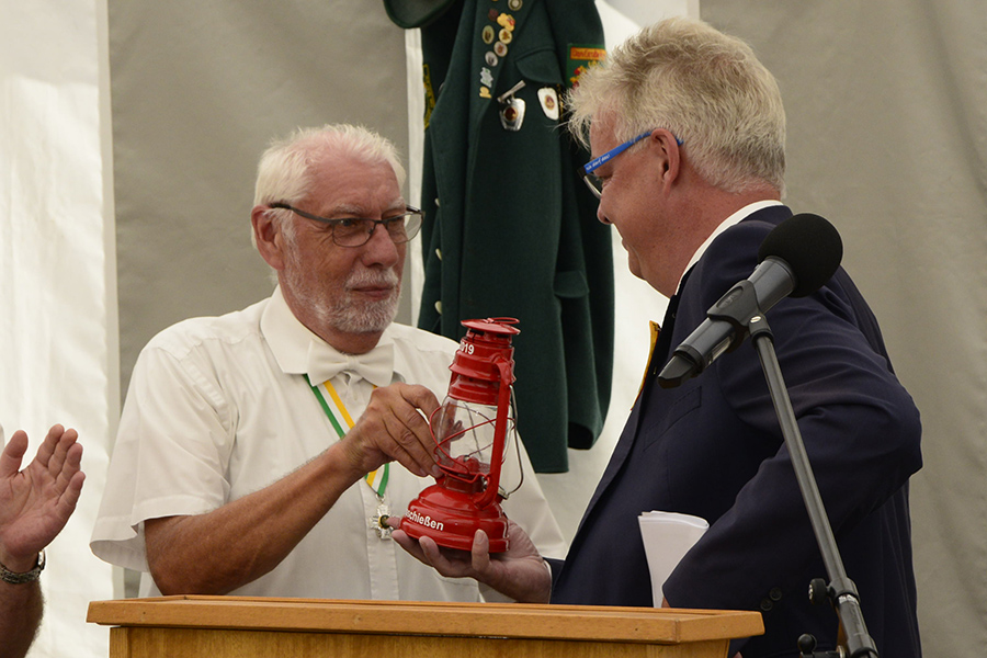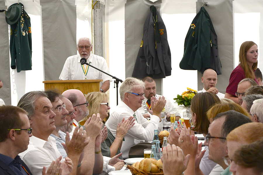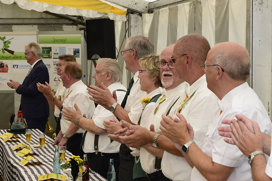 Mehr als 600 Gäste begrüßte das Schützencollegium Lehrte der beiden Lehrter Schützenvereine, der Bürgerschützen-Gesellschaft Lehrte und dem Schützencorps Lehrte, am heutigen Sonnabend, 27. Juli 2019, zum traditionellen Königsfrühstück im Festzelt. Die Tradition weiterleben lassen, um die neuen Könige zu ehren und zusammenzukommen, war an diesem Sonnabendvormittag sicherlich ein guter Grund für viele, zum gemeinsamen Frühstück zu kommen, doch dieses hielt noch zwei Besonderheiten parat. Da ist zum einen die Rede des Trägers der Roten Laterne des Ratsschießens, die in diesem Jahr der scheidende Bürgermeister Klaus Sidortschuk hielt. Aber eine besondere Ehrung wurde nicht nur von großem Applaus sondern auch von Standig Ovations begleitet..