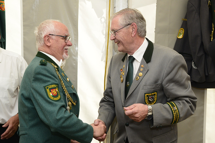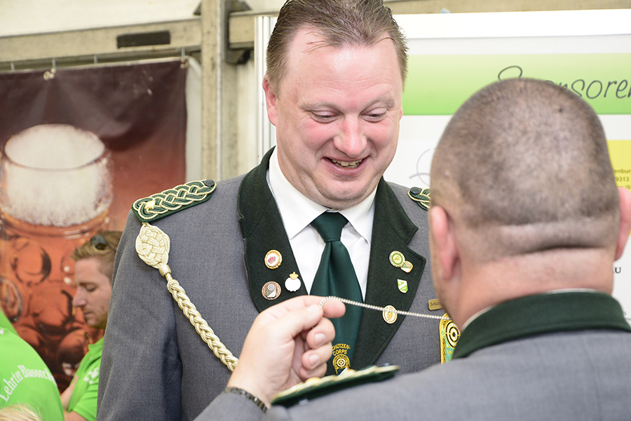 Der Präsident des Kreisschützenverbandes (KSV) Burgdorf, Werner Bösche, leitete die besondere Ehrung mit einer kleinen Laudatio ein. "Er ist ein verdienter Bürger dieser Stadt. Er ist seit Jahrzehnten für das Schützenwesen engagiert, aber nicht nur dort, sondern wirkt auch in Gesellschaft und Tradition. Er hat immer für alles und jeden ein offenes Ohr und sucht nach Lösungen", so der KSV-Präsident. Er habe bereits zahlreiche Ehrungen für sein Wirken bekommen, alle bereits in der höchsten Stufe: Gold. Da sein Engagement jedoch darüber hinaus gehe, habe der KSV eine neue Stufe der Ehrung ins Leben gerufen, die am heutigen Tag zum ersten Mal verliehen wurde. Die Ehrennadel in Gold mit Eichenkranz. Er rief daraufhin Reinhard Köln von der Bürgerschützen-Gesellschaft nach vorne, um ihm diese besondere Ehrennadel ans Revers zu stecken. Standing Ovations begleiteten die Ehrung, die mit dem gemeinsamen Schützengruß bekräftigt wurde. Erst am gestrigen Freitagabend hatte Reinhard Köln den Verdienstnorden des Schützencollegium der Stadt Lehrte erhalten.