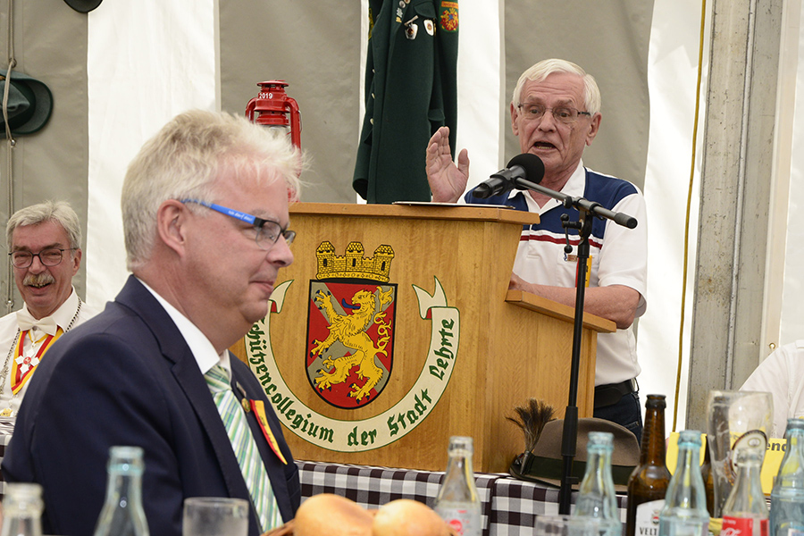 Klaus Sidortschuk zeigte sein Reimtalent und unterhielt die Gäste mit lockeren und lustigen Zweizeilern, garniert jeweils mit dem Satz "Wir leben in der schönen Stadt, die so tolle Menschen hat". Er setzte aber auch politische Akzente in seiner Rede wie den Erhalt des Schützenplatzes. "Auf diesem Platz werden die Schützen auch in Zukunft feiern", betonte er. "Der Schützenplatz bleibt hier, darauf wette ich ein Fass Bier", reimte er. Hinsichtlich von Angriffen auf Rettungskräfte und Ehrenamtliche reimte er seinen Abschlussatz um und endete nun mit "…die solche Menschen wenig nötig hat". Und bezogen auf die ewigen Nörgler, Meckerer und Populisten dichtete er abermals um: "…die solche Menschen gar nicht nötig hat". Er forderte sie auch, "doch mal zu kommen und selbst zu machen". Menschen, die Lehrte dagegen "noch mehr nötig hat" seien dagegen die Ehrenamtlichen und Engagierten in der Stadt. Er endete mit den Worten "Glück auf – schöne Heimat Lehrte" und erhielt für seine Worte ebenfalls Standing Ovations.