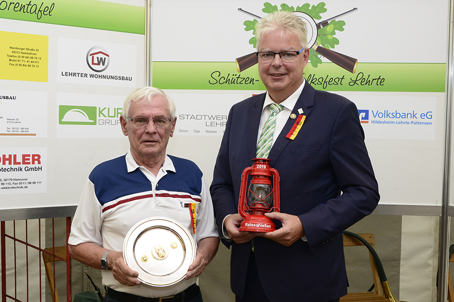 Mit weitaus weniger Ruhm und Ehre haben sich in diesem Jahr allerdings die Teilnehmer des Ratsschießens bekleckert. 43 Ring war das beste Ergebnis, mit 37 Ring erhielt man als Letztplatzierter die Rote Laterne. Mehrere Schützen waren disqualifiziert worden, weil sie auf andere Scheiben als die eigenen geschossen hatten. Darunter auch Schützensenator und 1. Stadtrat Uwe Bee. "Da muss ich noch über ein Disziplinarverfahren nachdenken", so Lehrtes Bürgermeister Klaus Sidortschuk mit einem Augenzwinkern. Er betonte auch, dass er mit seinen 37 Ring nicht absichtlich Letzter werden wollte, um im letzten Jahr seiner Amtszeit noch einmal eine Rede vor den Schützen und ihren Gästen halten zu können. "37 Ring schießt doch niemand, der die Rote Laterne haben will", erklärte er. Noch nie sei jemand mit einem solchen Ergebis Letzter geworden und auch der Abstand zum ersten Platz sei noch nie so gering gewesen.