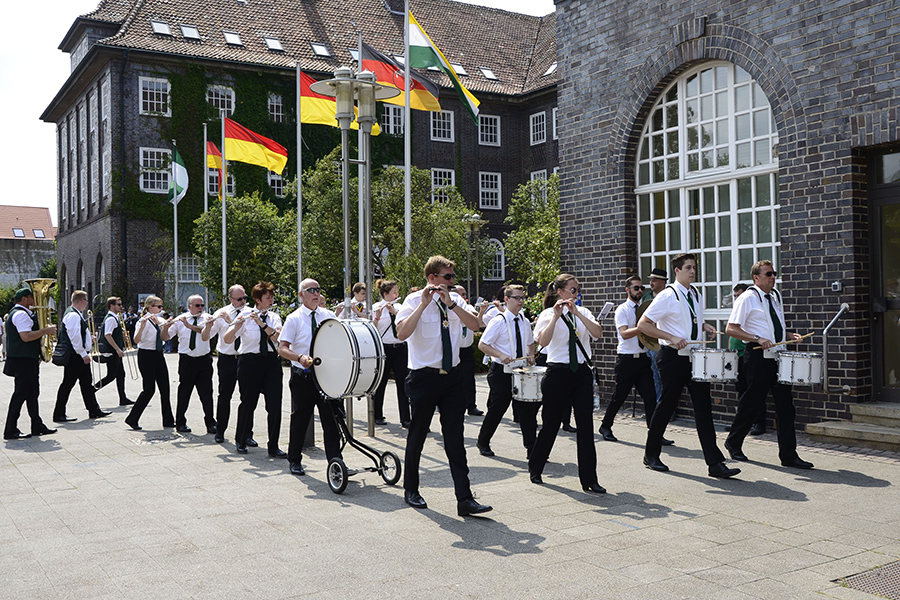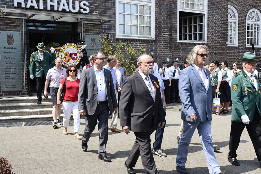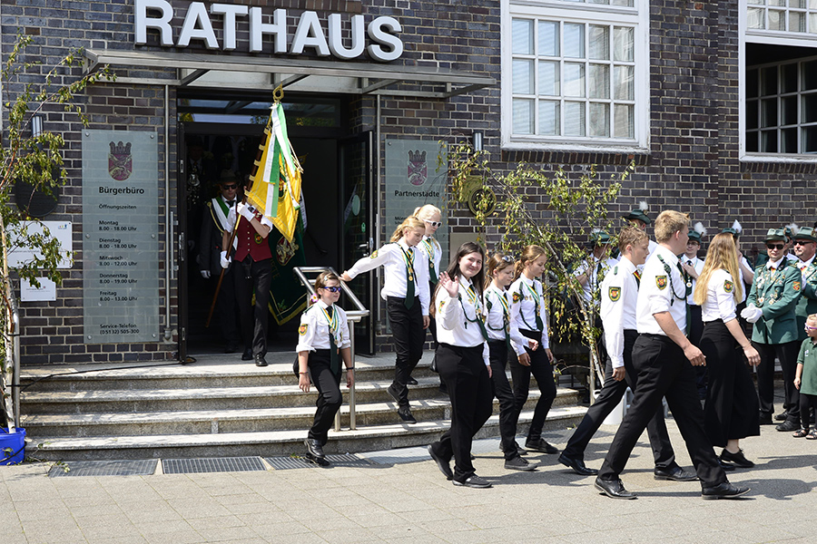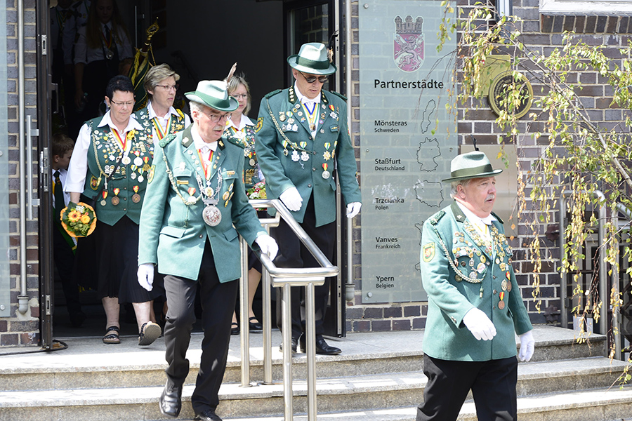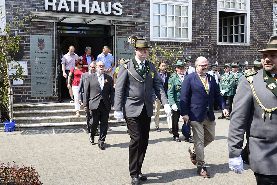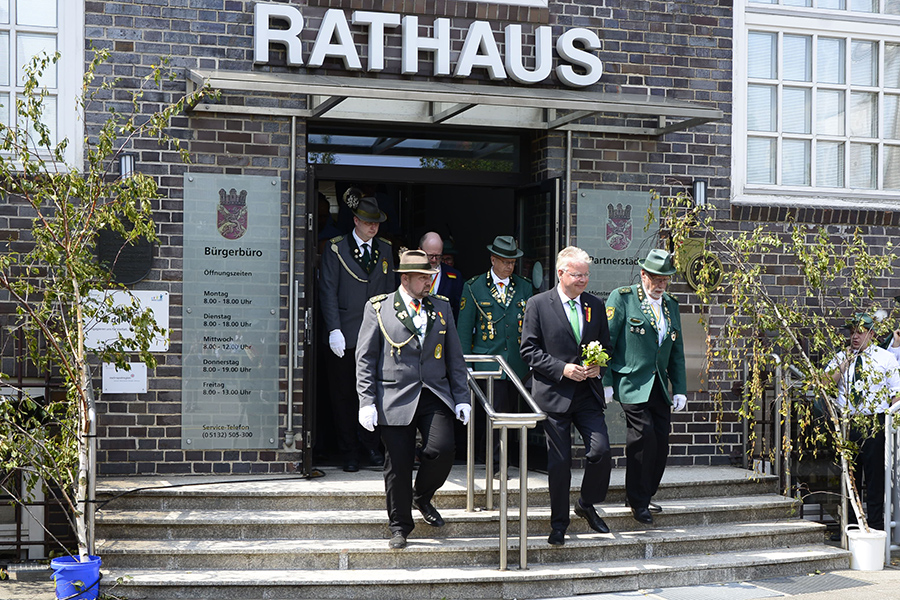 Erstmals spielten die Jagdhornbläser der Bürgerschützen-Gesellschaft vor dem Auszug der Majestäten aus dem Rathaus nicht alleine. Sie hatten Verstärkung durch die befreundete Jagdhorn-Bläsergruppe aus Velpke bekommen. Nachdem die Majestäten sich unter dem Präsentiermarsch für den Umzug aufgestellt hatten, konnte der große Festumzug durch die Innenstadt starten. Wie gewohnt waren die Straßen von vielen Zuschauern gesäumt, die den Schützen und ihren Gästen zujubelten.