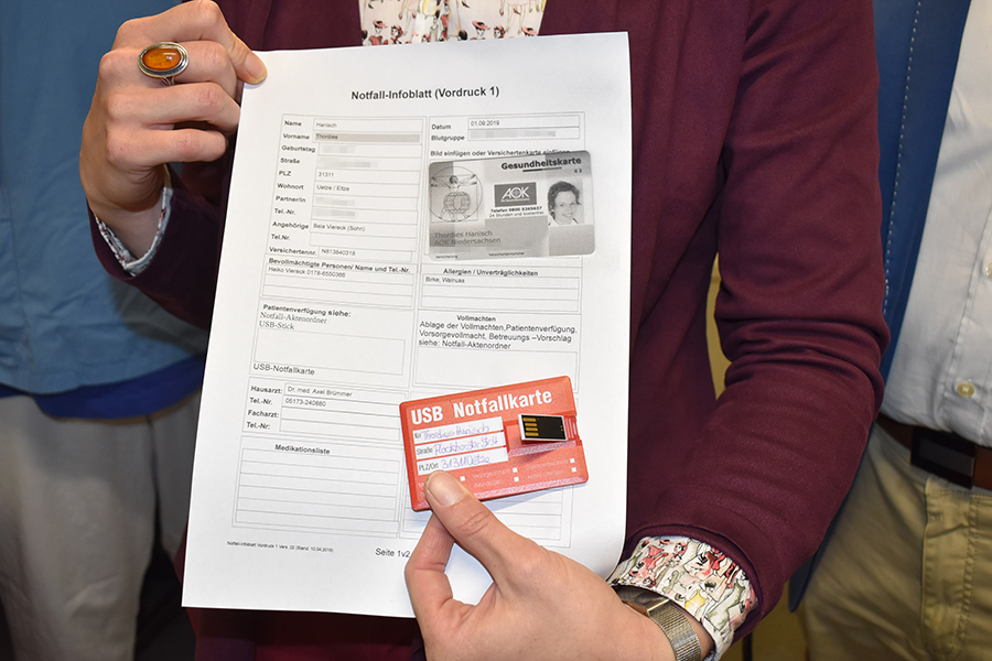 Die digitale USB-Notfallkarte wurde in Absprache mit dem Klinikum Ost der Region Hannover konzipiert und angewendet und erfreut sich wachsender Nachfrage. Um auf dieses sinnvolle Angebot aufmerksam zu machen und das Einsatzgebiet über die Burgdorfer Stadtgrenzen hinaus zu erweitern, besuchte Thordies Hanisch das Klinikum in Lehrte. Sie setzt sich als Schirmherrin dafür ein, dass mehr Bürger sich mit der USB-Notfallkarte ausrüsten. Ihre USB-Notfallkarte wurde von Andre Hoffmann von der Notfallaufnahme des Klinikum Ost, Lehrte, zu Präsentationszwecken ausgedruckt.