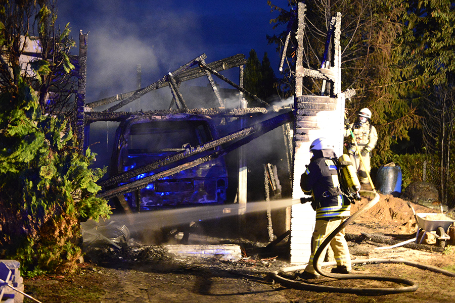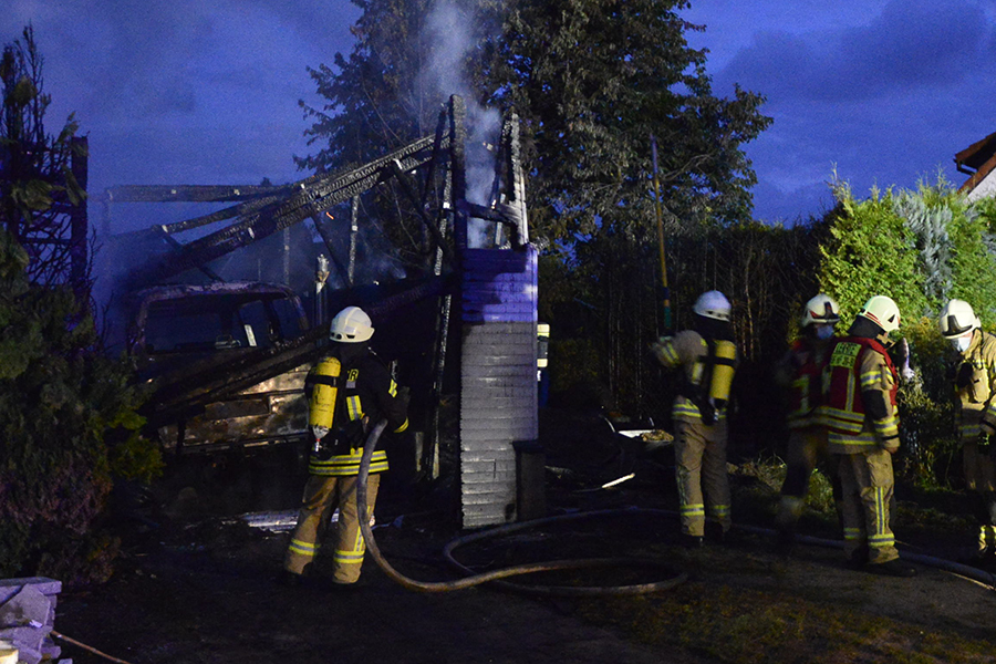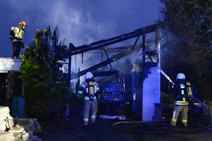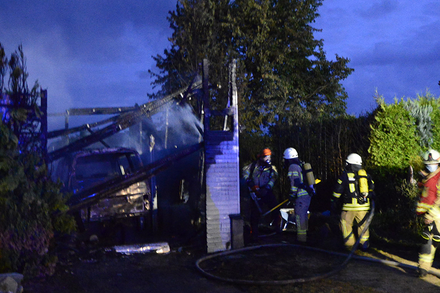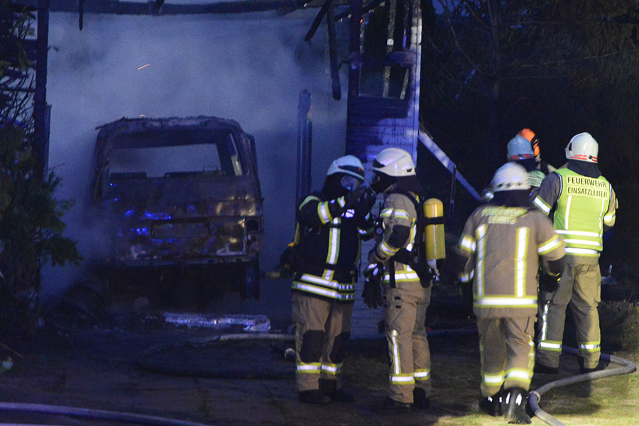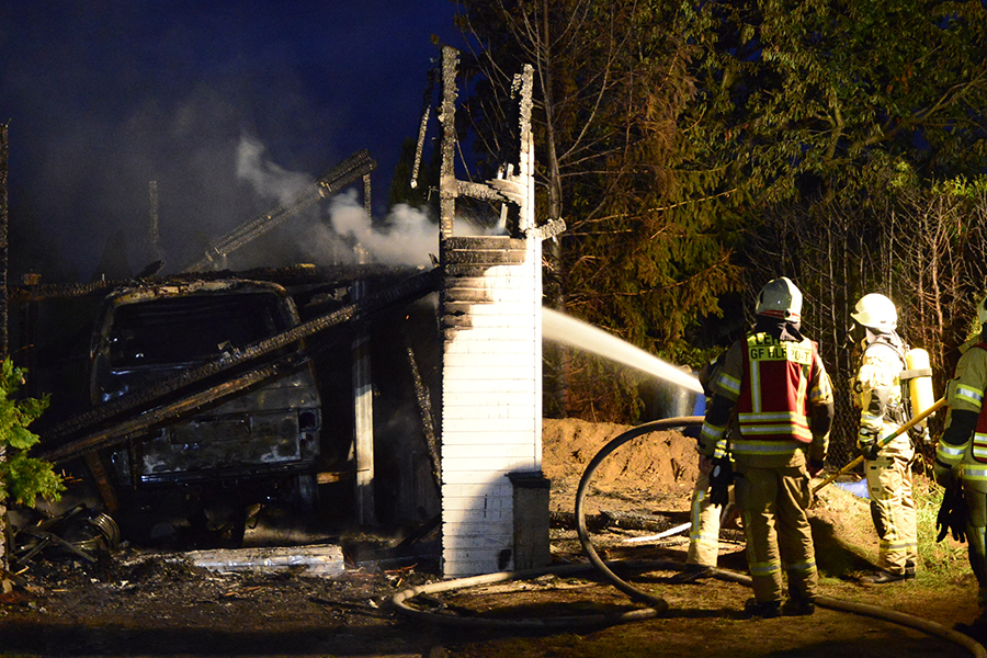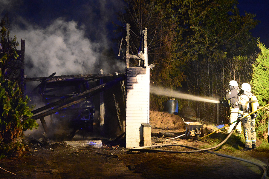 Der stellvertretende Ortsbrandmeister Marco Beimes, der auch den Einsatz leitete, fand bei seiner Ankunft mit dem ersten Löschfahrzeug allerdings keine gewöhnliche Garage vor. Ein etwa vier Meter hohes und rund 3×6 Meter großes Gebäude stand in Vollbrand und die Flammen waren bereits in Begriff, auf das angrenzende Wohngebäude überzugreifen.