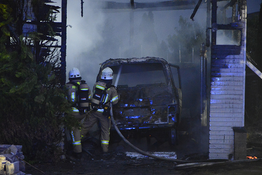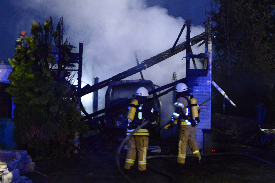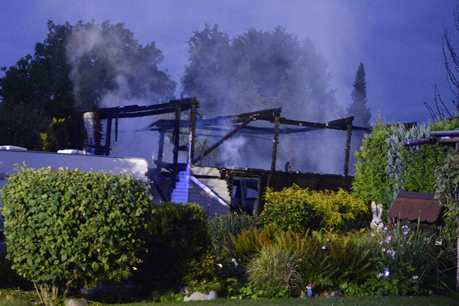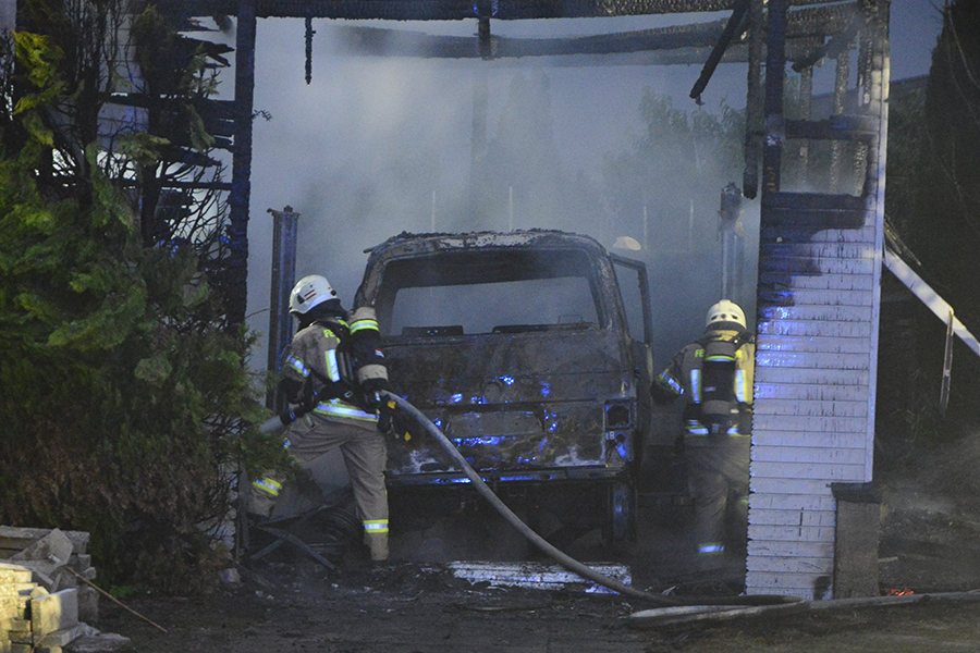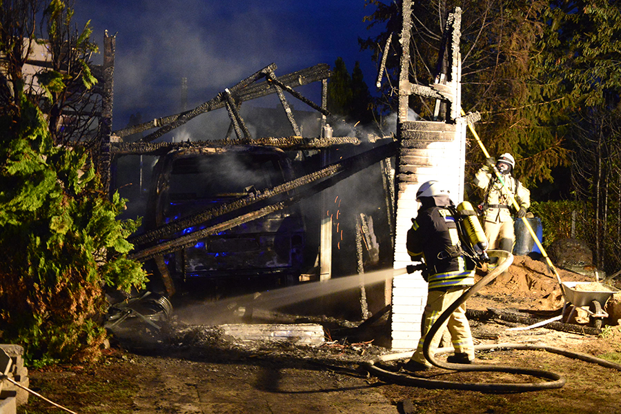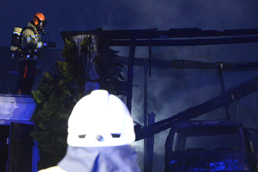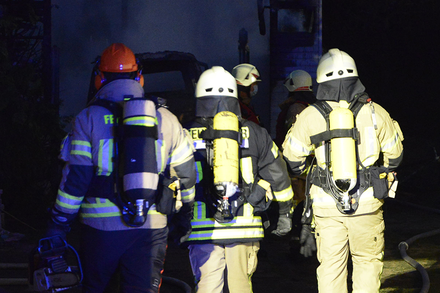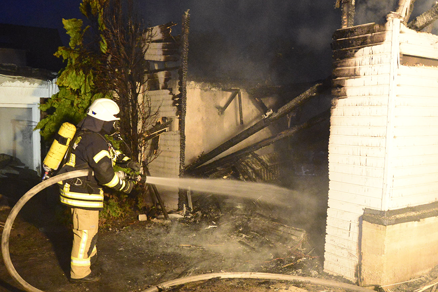Der stellvertretende Ortsbrandmeister Marco Beimes, der auch den Einsatz leitete, fand bei seiner Ankunft mit dem ersten Löschfahrzeug allerdings keine gewöhnliche Garage vor. Ein etwa vier Meter hohes und rund 3×6 Meter großes Gebäude stand in Vollbrand und die Flammen waren bereits in Begriff, auf das angrenzende Wohngebäude überzugreifen.