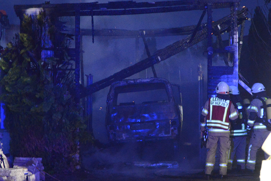 Er ließ zwei Trupps unter Atemschutz mit zwei C-Rohren vorgehen, die zunächst das Wohngebäude vor den Flammen schützten und die Flammen zurückschlugen. Bereits um 20:46 Uhr konnte an die Regionsleitstelle gemeldet werden, dass das Feuer unter Kontrolle ist. Das vollständige Abbrennen der Garage konnten die ehrenamtlichen Brandbekämpfer allerdings nicht mehr verhindern. Auch der in der Garage befindliche VW Transporter wurde bei dem Feuer komplett zerstört.