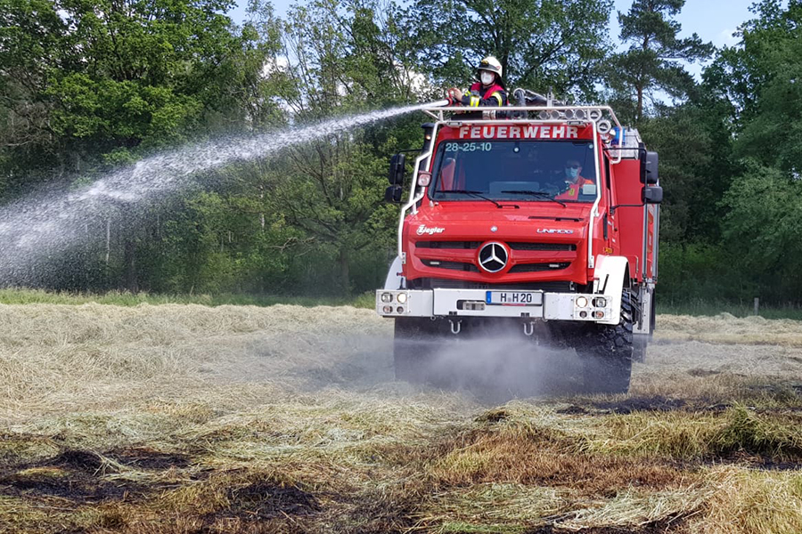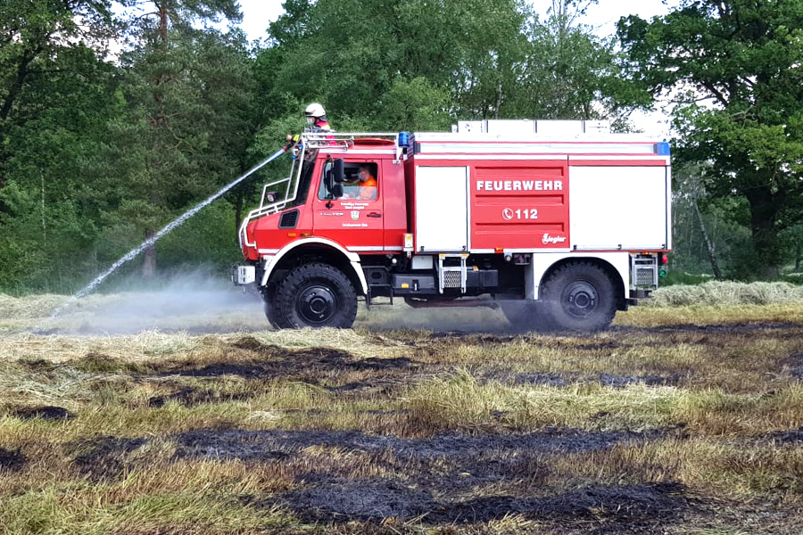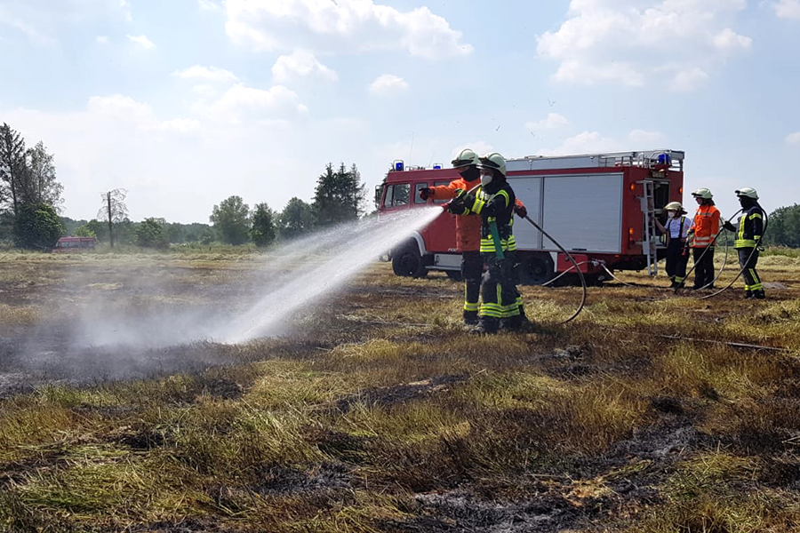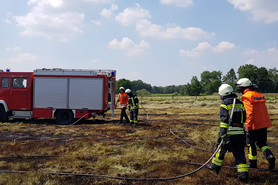 Die sehr warmen Temperaturen sowie die abgelegene Einsatzstelle führten zu einer besonderen Belastung der ehrenamtlichen Feuerwehrkräfte, die nicht nur mit Wasser, sondern auch beispielsweise mit Feuerpatschen vorgingen.