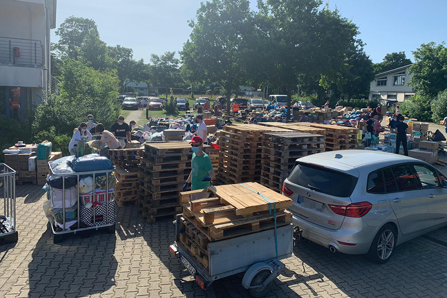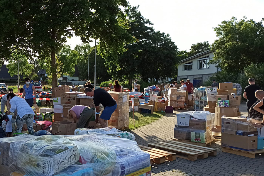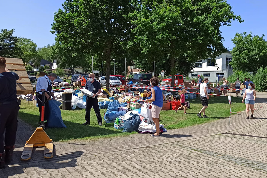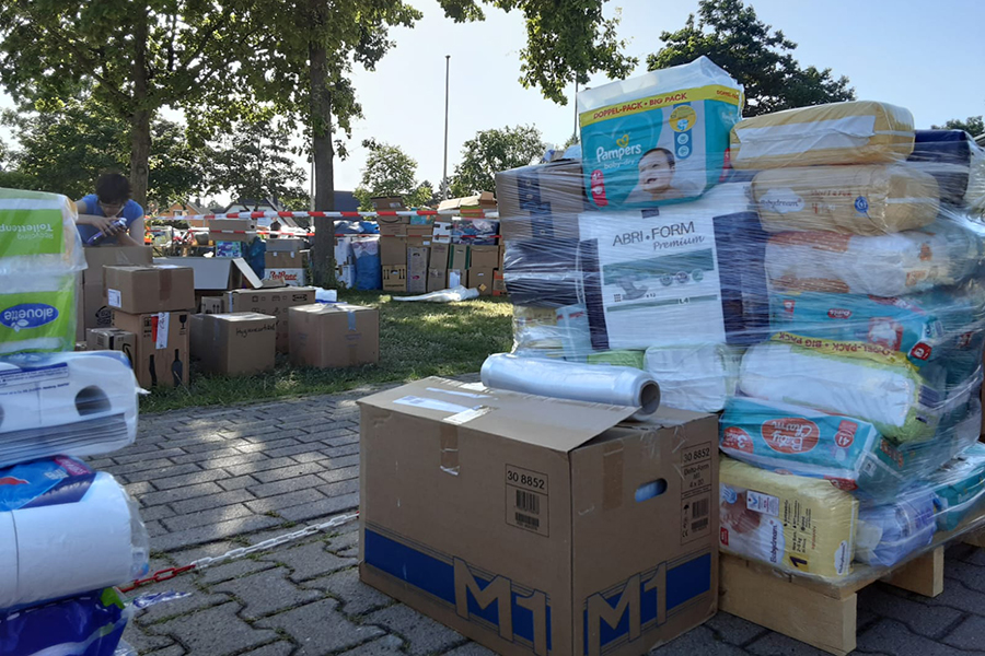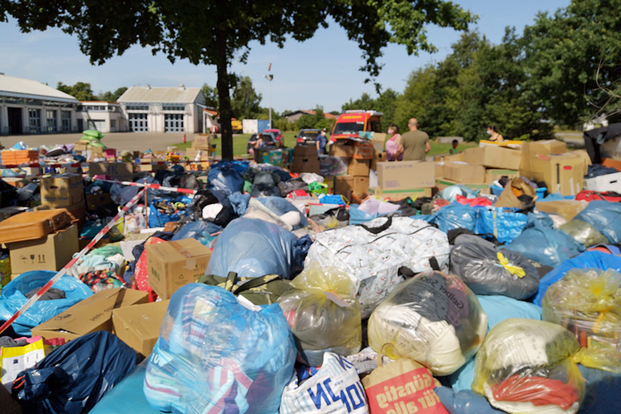 Was dann aber an Hilfsgütern kam, übertraf die Vorstellungen der Feuerwehrkräfte: Schnell waren die Kapazitäten erschöpft, es fehlte an Paletten und Gitterboxen. Die Firma Parlasca half mit Gitterboxen aus, zudem boten Unternehmen ihre Hilfe zum Transport an. Permanent-Marker, die die Feuerwehr mal eben schnell vom Edeka holen wollte, mussten – als bekannt wurde dass es sich um die Unwetterhilfe handelte – ebensowenig bezahlt werden wie die Pizza-Bestellung für die ehrenamtlichen Helfer bei Fortore.