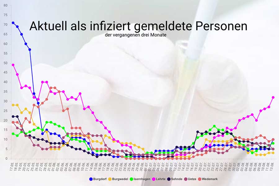 Wie die Regionsverwaltung am heutigen Freitag, 13. August 2021, um 13 Uhr bekannt gibt, hat sie seit Auftreten der ersten Corona-Infektion insgesamt 49.841 Menschen registriert, die sich in der Region mit dem Coronavirus infiziert haben. Das sind 110 Fälle mehr als am vergangenen Mittwoch. Am gestrigen Donnerstag hatte die Region Hannover keine aktuellen Zahlen gemeldet.