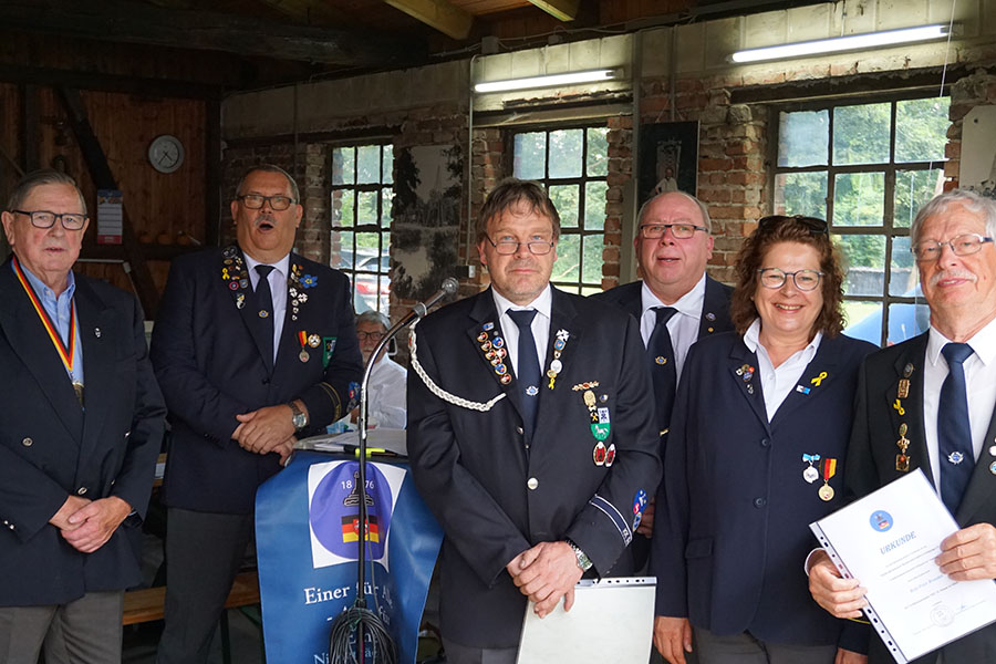 Weiter ging es mit den Ehrungen für langjährige Mitglieder. So konnten Mitglieder für ihre 10-, 20- und 25- und 30-jährige Mitgliedschaft geehrt werden. Erwin Hiete erhielt das Sportschützen-Verdienstkreuz in Bronze. Der Landesvorsitzende Stemme ehrte anschließend die Kameraden Rolf-Peter Brandes mit der Verdienstnadel des NKV in Silber und Hartmut Feldmann mit der Schießsportehrennadel.