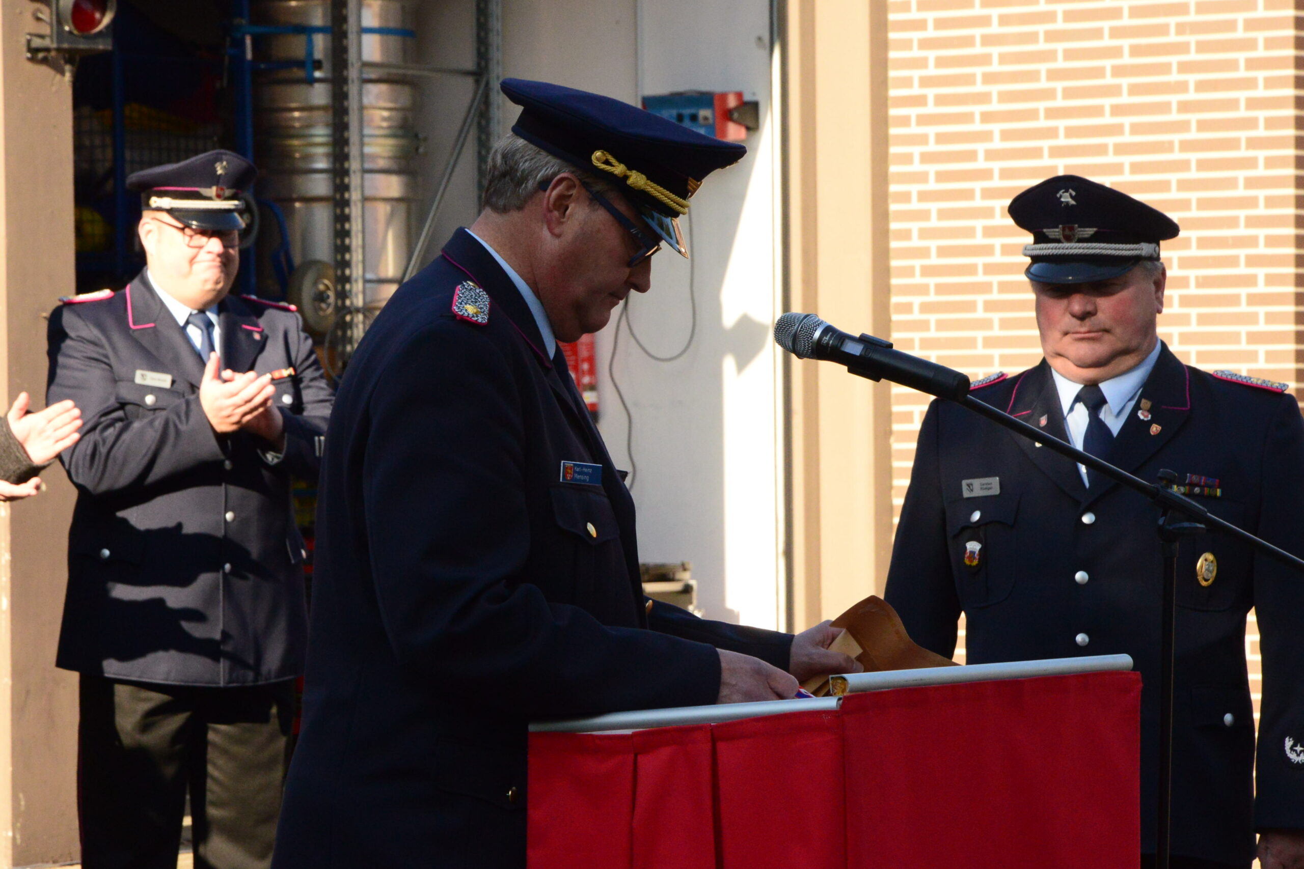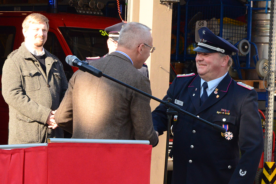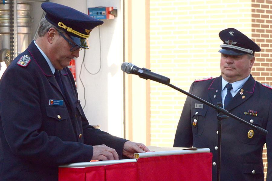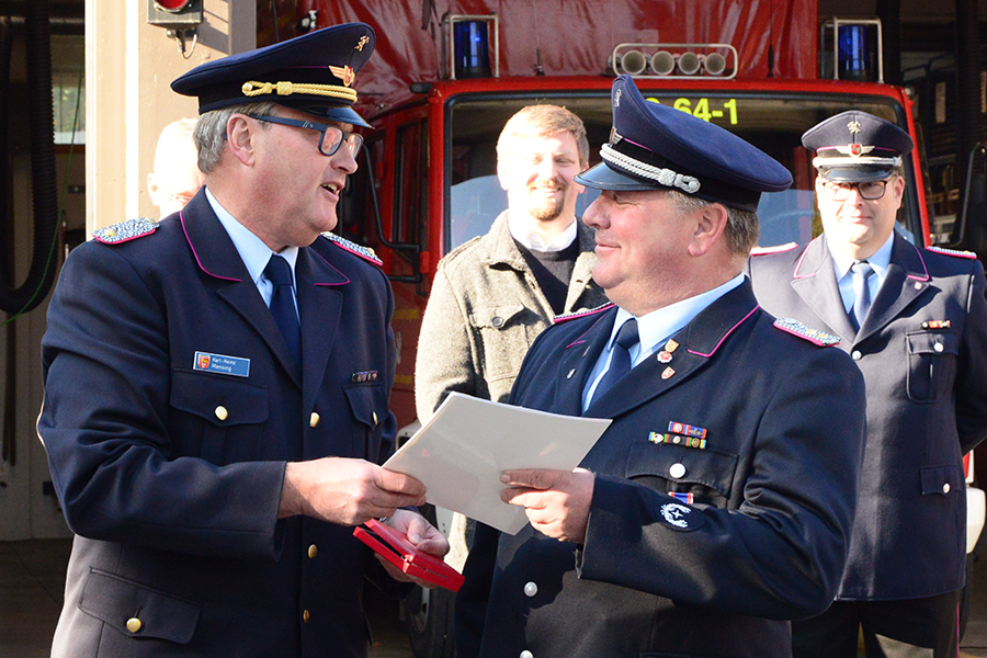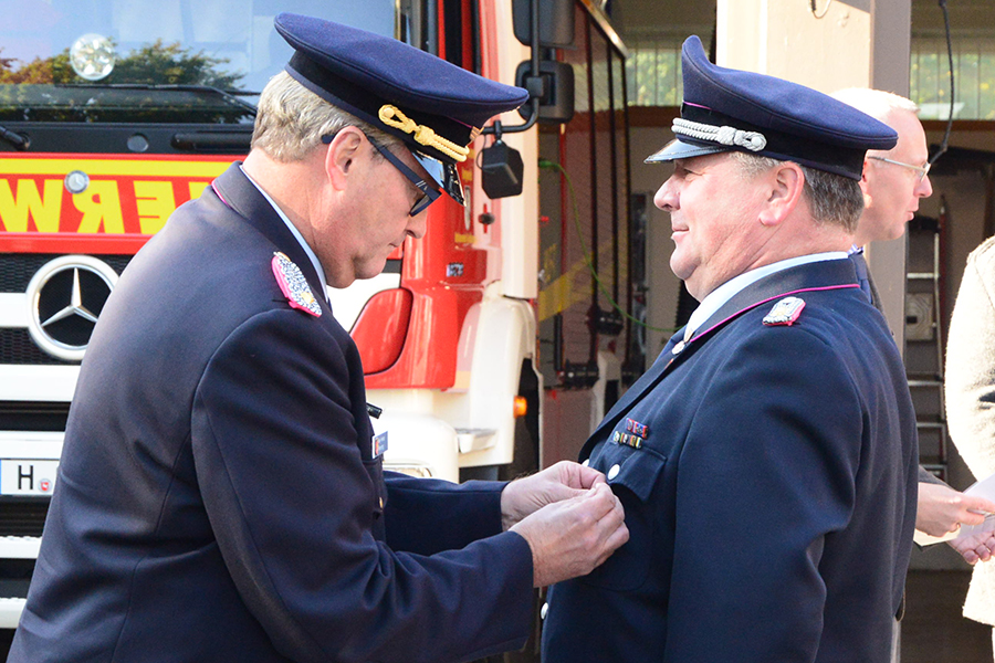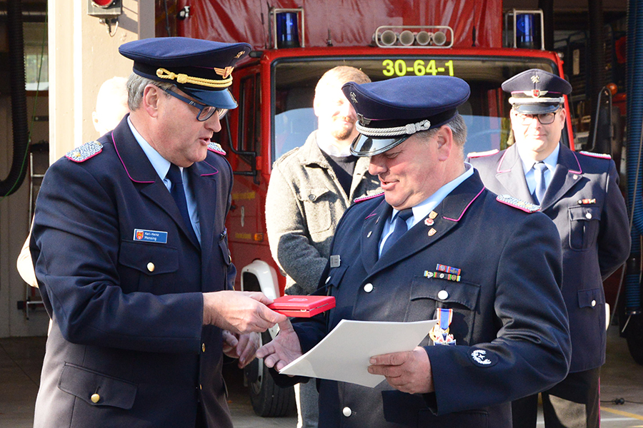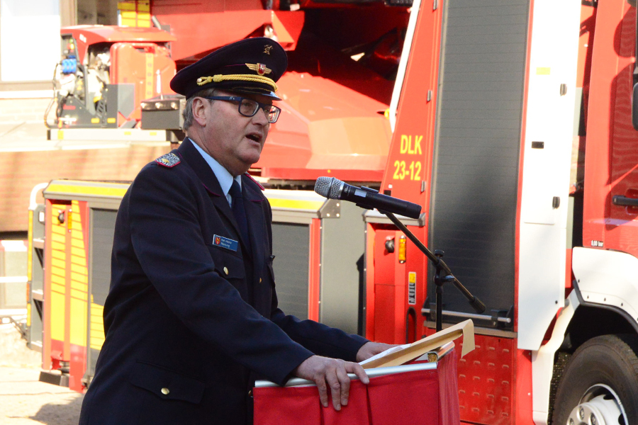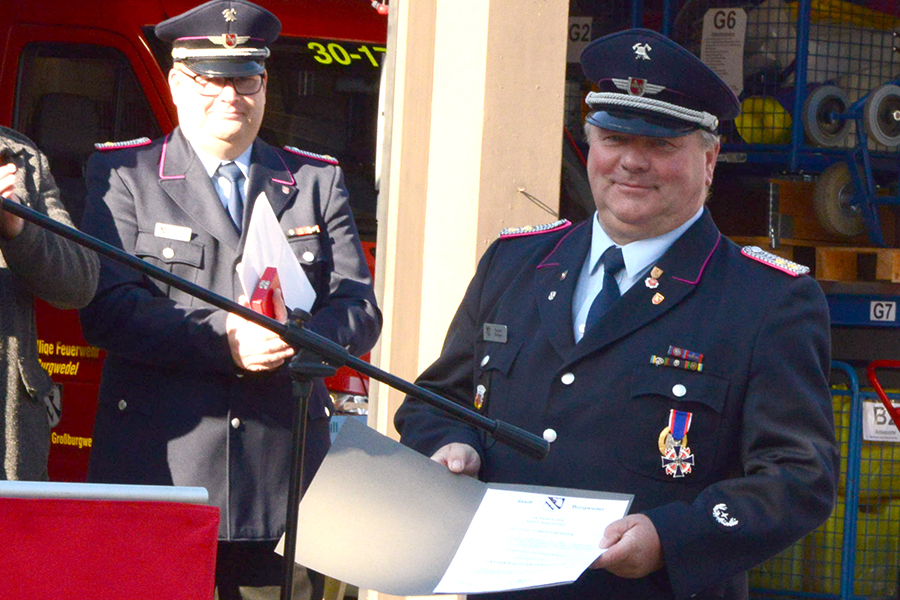 "Die schönste und teuerste Drehleiter ist es nicht Wert, wenn nicht die Kameradinnen und Kameraden in den blauen Uniformen sie bedienen", betonte Stadtbrandmeister Carsten Rüdiger, der selbst über Jahre auf die Anschaffung einer Drehleiter drängte. "Das ist ein historischer Tag für die Stadt Burgwedel", so der Stadtbrandmeister. Für Carsten Rüdiger hielten Regionsbrandmeister Karl-Heinz Mensing und Bürgermeister Axel Düker noch zwei Überraschungen bereit: Für besonderen Einsatz und als Anerkennung erhielt Carsten Rüdiger das Deutsche Feuerwehr-Ehrenkreuz in Silber. Es ist die zweithöchste Auszeichnung, die in der Deutschen Feuerwehr zu vergeben ist. Zudem wurde der Stadtbrandmeister der Dienstgrad "1. Hauptbrandmeister" verliehen.