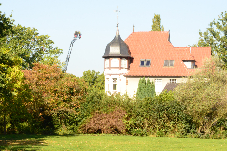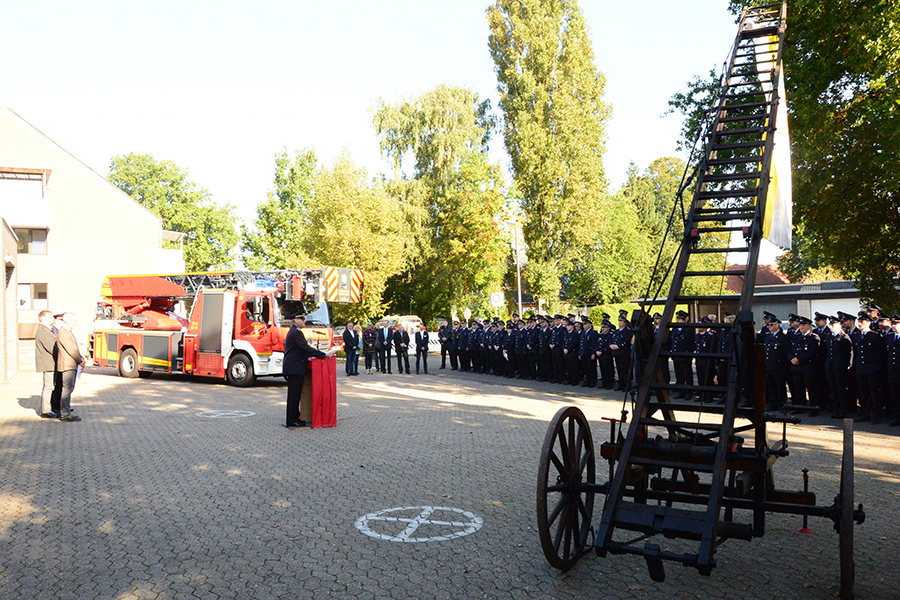 Zwei Leitern begrüßten die Besucher am heutigen Sonnabend, 9. Oktober 2021, die Gäste zur offiziellen Übergabe der Drehleiter an der Großburgwedeler Feuerwache: Die eine aus Holz und aus dem Jahr 1932, vollständig manuell bedienbar, und ein sogenanntes Hubrettungsfahrzeug, ausgestattet mit der modernsten Technik.