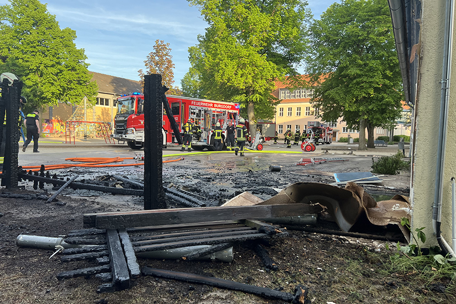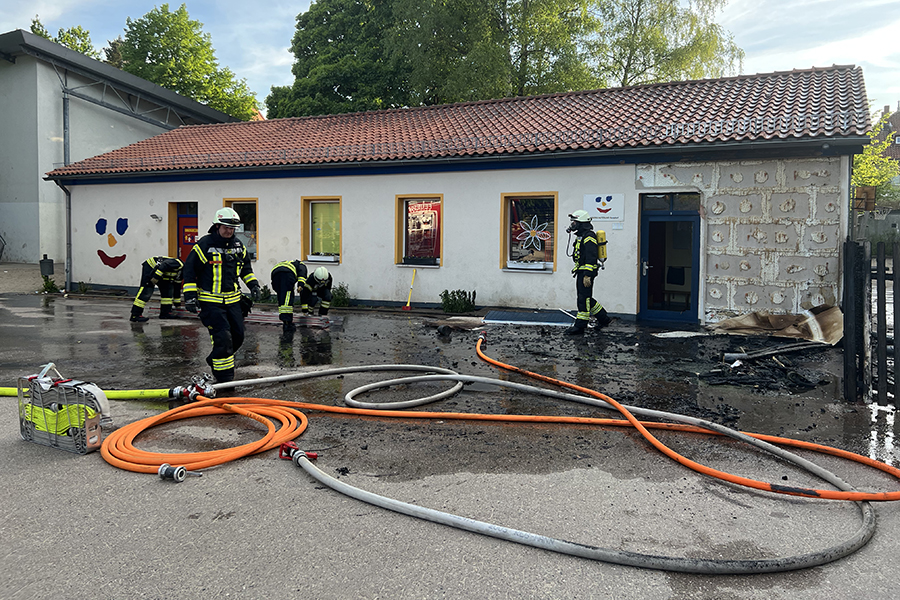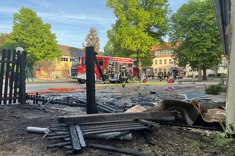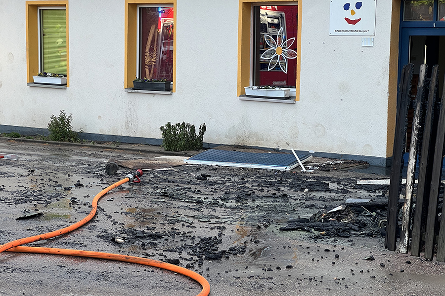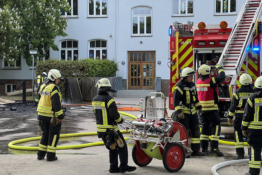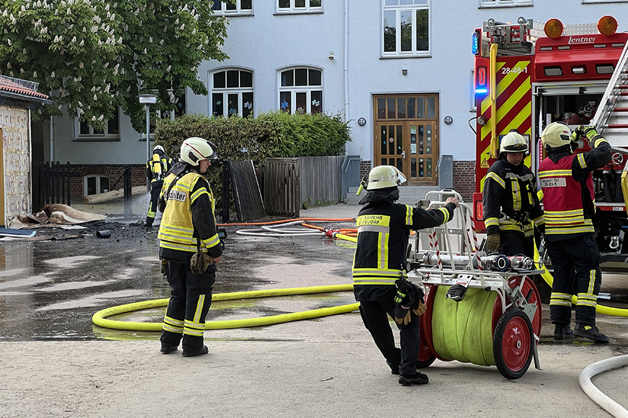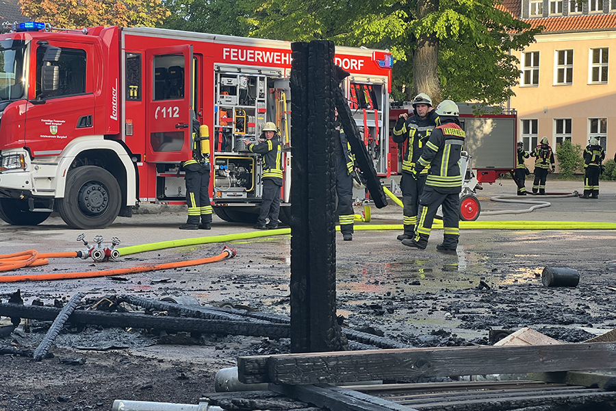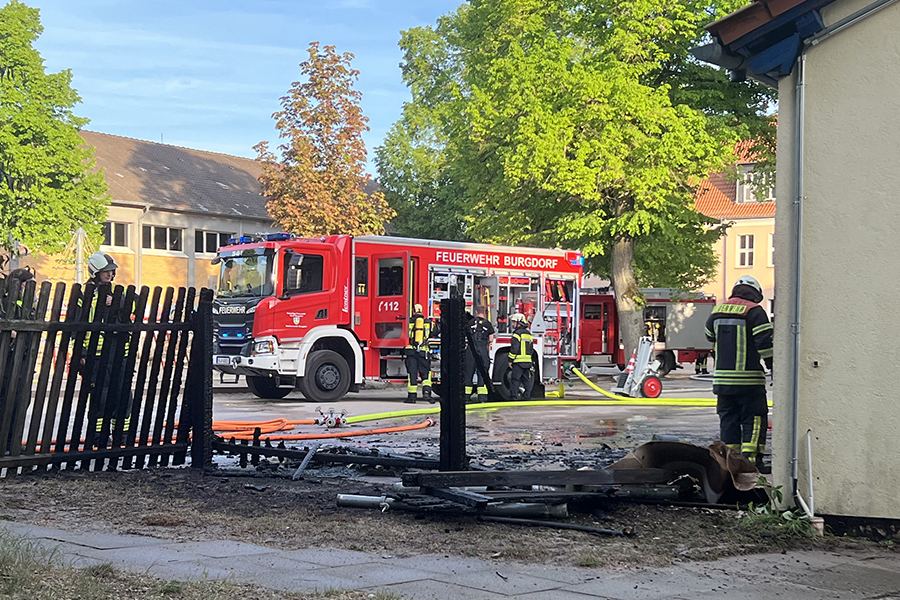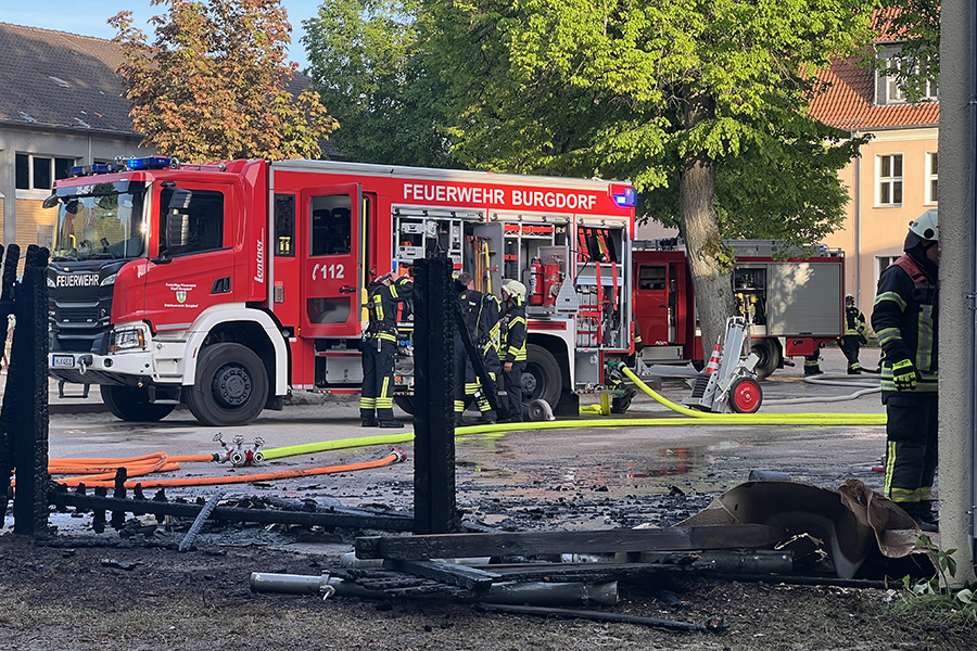 Mit vier Fahrzeugen rückten die Brandbekämpfer der Ortsfeuerwehr Burgdorf aus. Als sie ankamen, waren zwei Container, die in der Nähe eines Gebäudes Brand standen, bereits weitestgehend niedergebrannt. Doch die Flammen hatten nun genügend Zeit gehabt, sich auf das danebenliegende Gebäude auszubreiten und drohten nun, auch auf das Gebäude überzugreifen.
