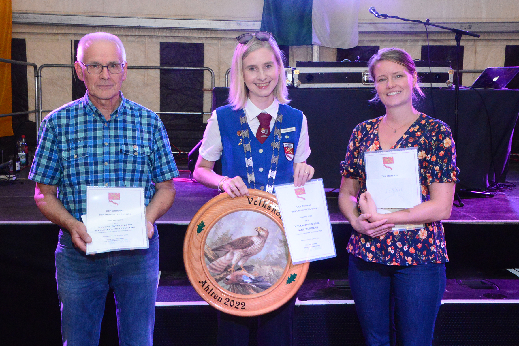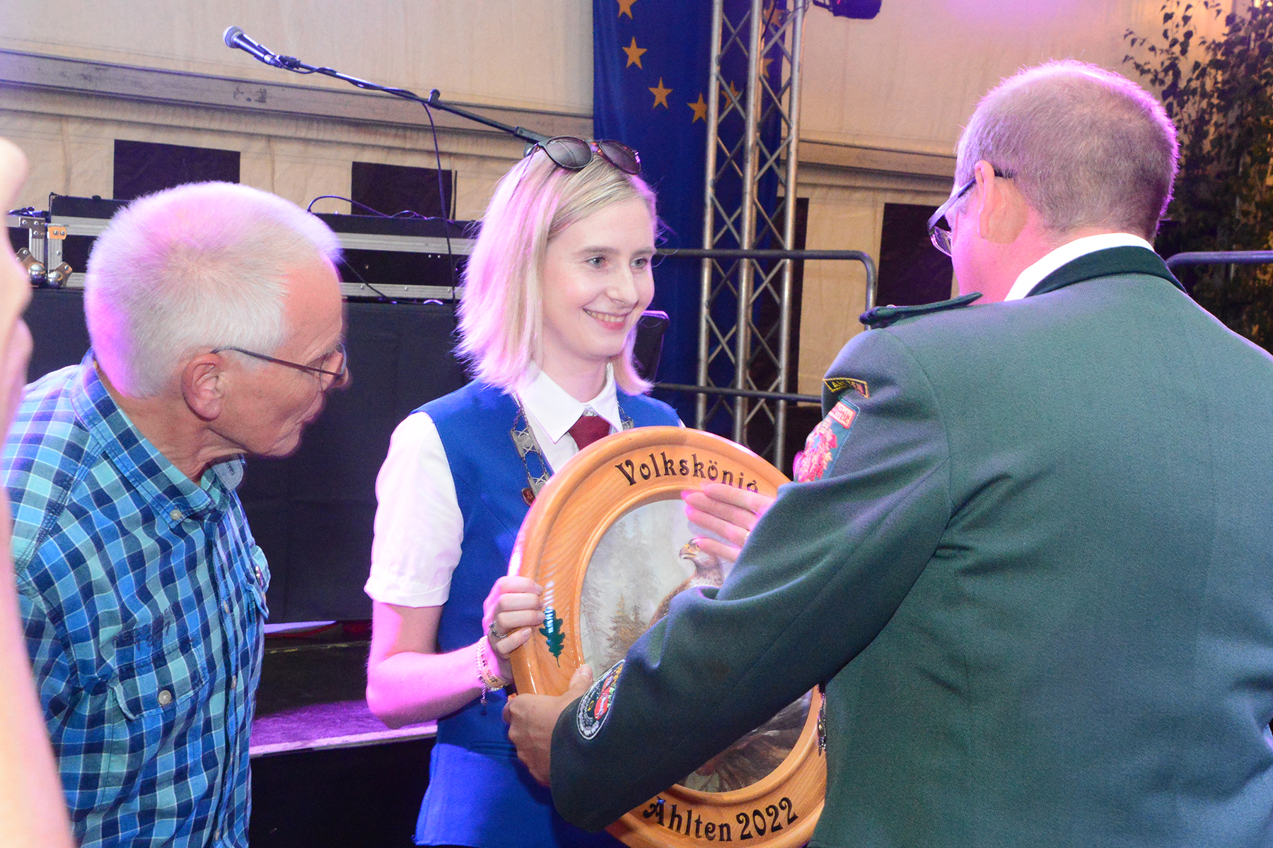 Damit waren aber noch nicht alle Posten der Majestäten vergeben. Bis zum Schützenfestsonnabend bleibt geheim, wer denn die Würde des Volkskönigs errungen hat. Gewonnen hat Sina Blomberg, die als Mitglied der Ahltener Musikanten an dem Abend auch für den musikalischen Rahmen gesorgt hatte. 1. Ritter wurde Bernhard Hebbelmann und 2. Hofdame ist Claudia Schneider.